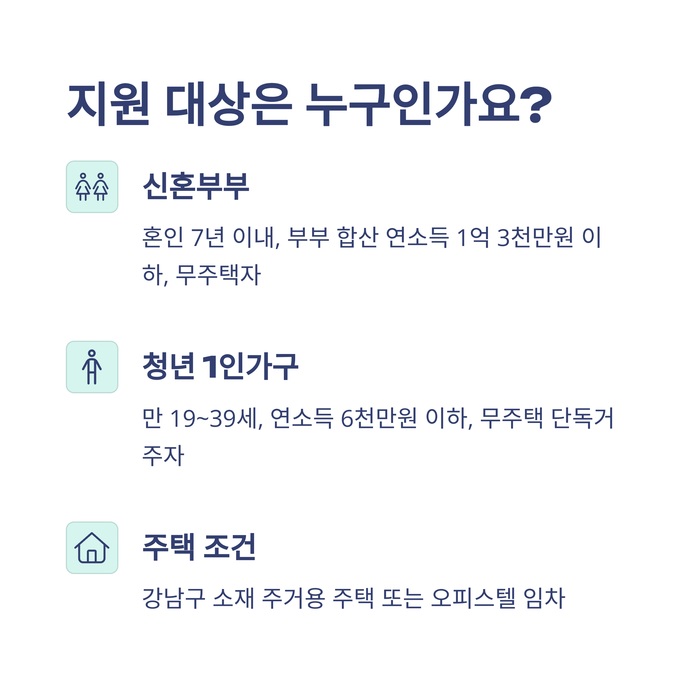 - 임차 조건: 강남구 소재 주거용 주택 또는 오피스텔 임차