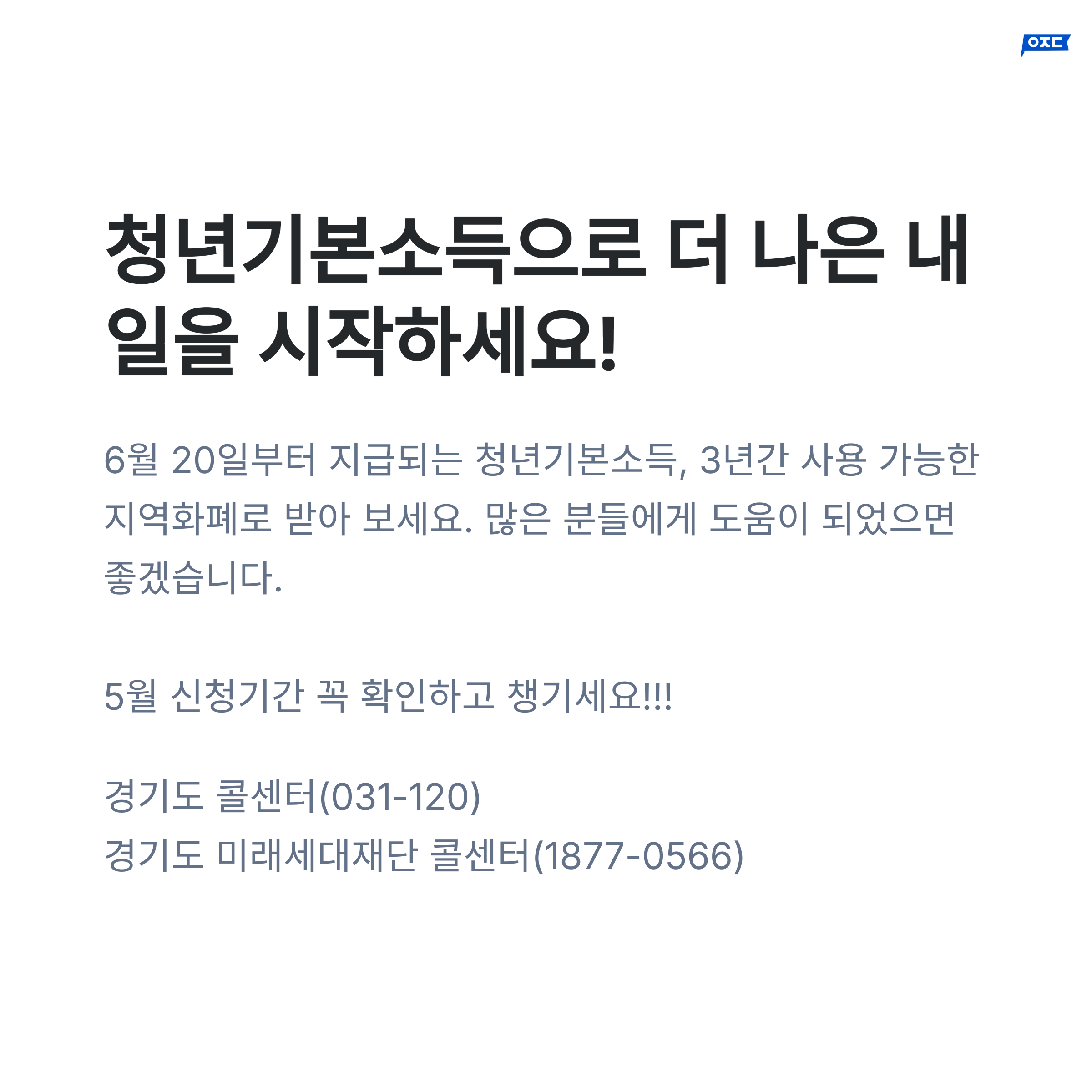 지금까지 2025년 경기도 24세 청년기본소득 5월 신청방법 및 준비서류에 대해 알아보았습니다. 청년기본소득은 경기도에 사는 24세 청년들에게 연간 100만원을 지원하는 소중한 혜택입니다.