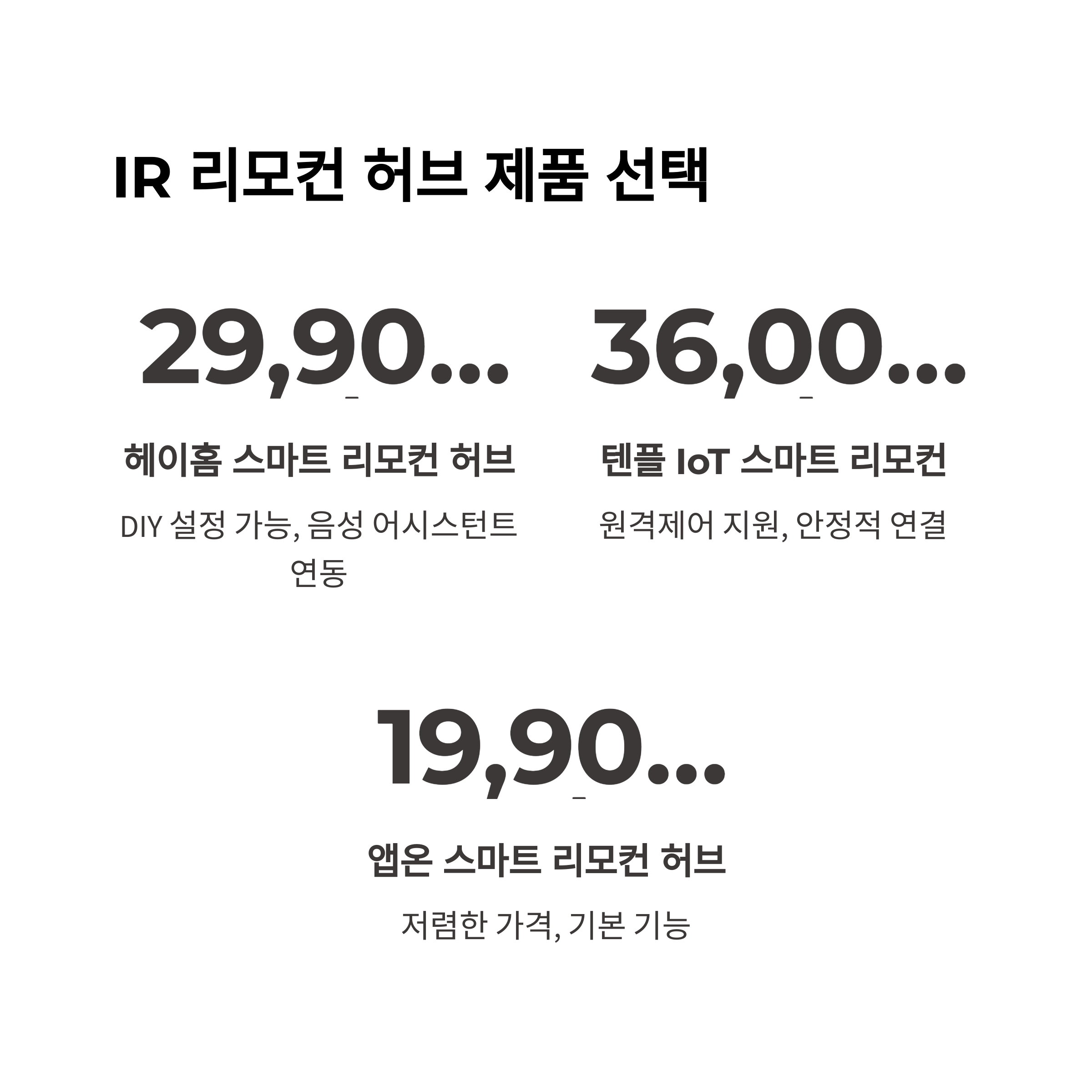 | 앱온 스마트 리모컨 허브 | 19,900원 | 저렴한 가격, 기본 기능 | ⭐⭐⭐ |