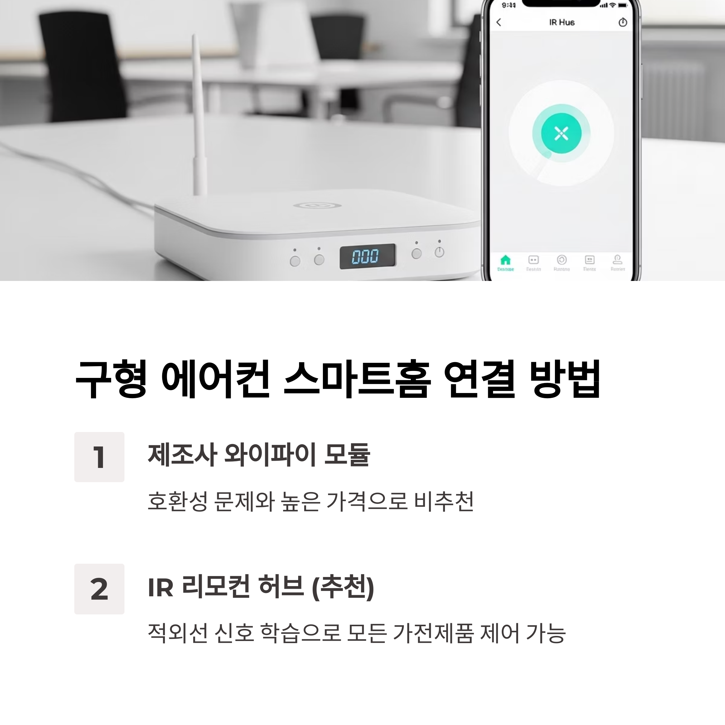 구형 에어컨도 IR(적외선) 리모컨 허브를 통해 스마트폰으로 원격 제어가 가능하며, 음성 어시스턴트 연동까지 할 수 있습니다. 이 글에서는 위니아 에어컨을 중심으로 스마트홈 구축 방법을 상세히 알아보겠습니다.