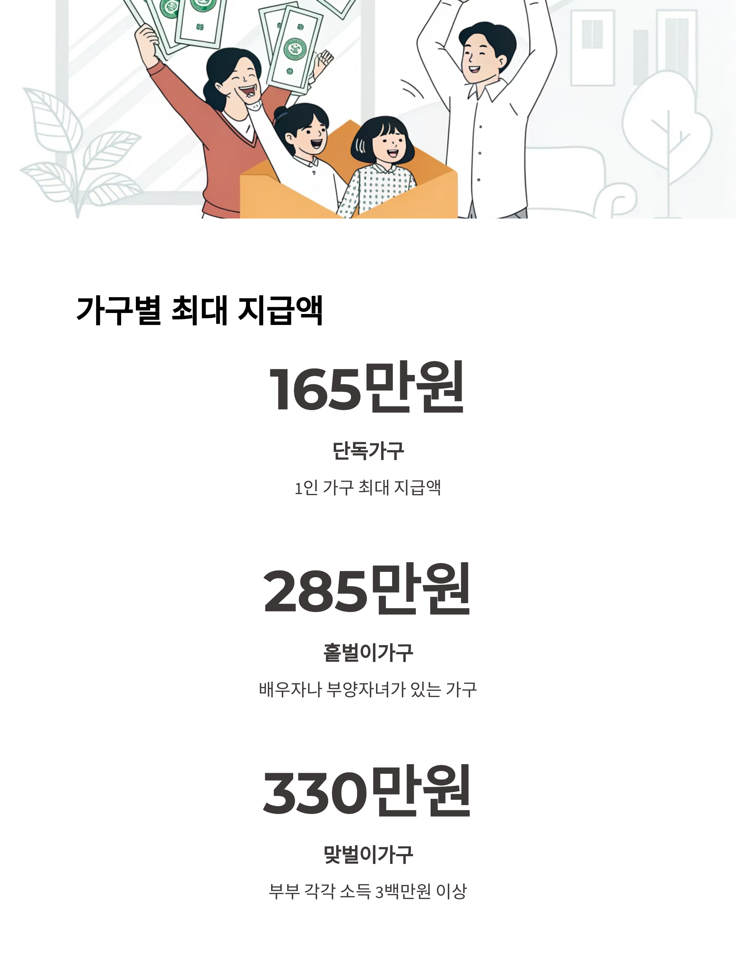 • 가구 유형(단독, 홑벌이, 맞벌이)에 따라 지급액이 크게 달라지므로 정확한 확인이 필요합니다.