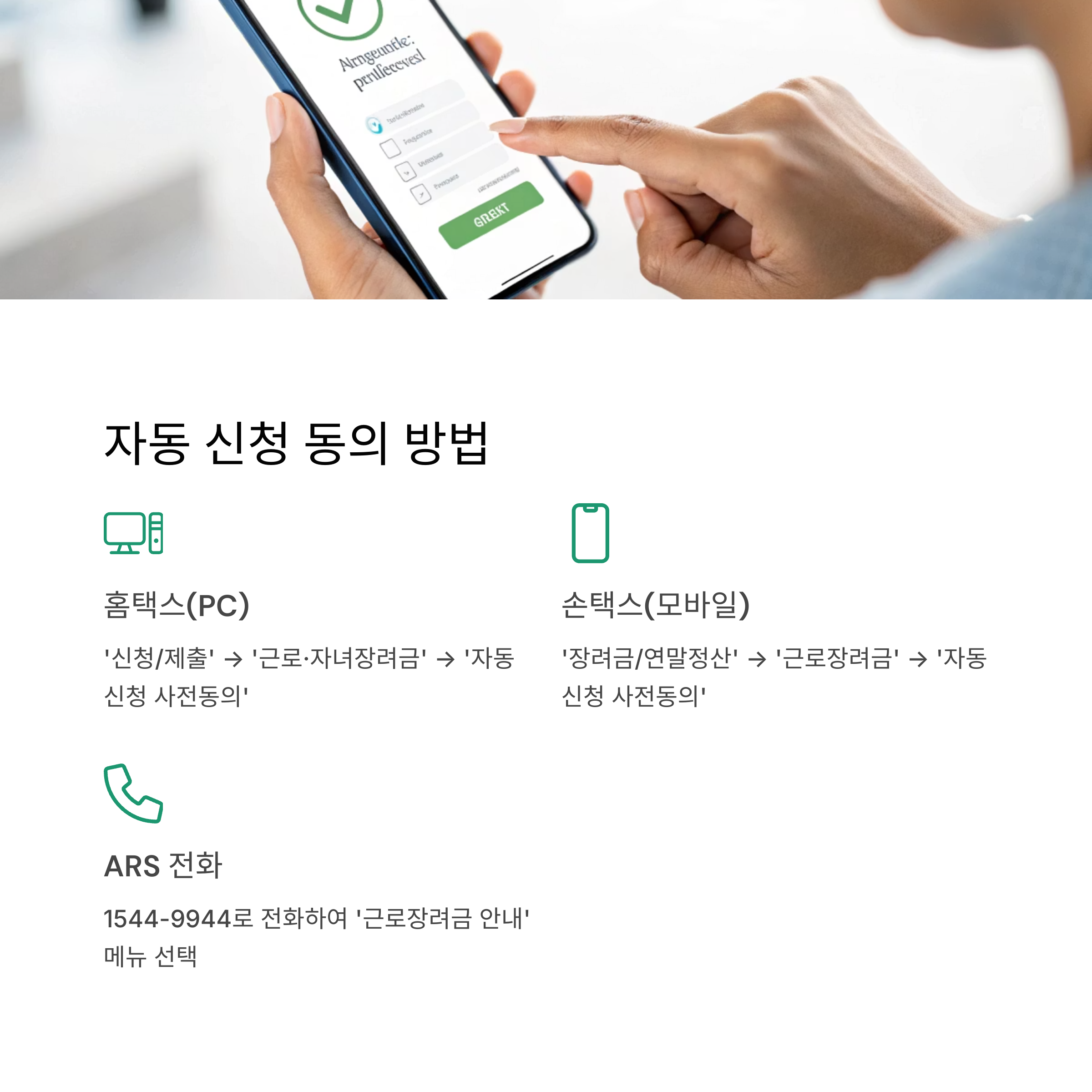 근로장려금 자동 신청 혜택을 받기 위해서는 먼저 자동 신청에 동의하는 절차가 필요합니다. 동의는 PC, 모바일, ARS 등 다양한 방법으로 진행할 수 있으며, 각 방법별 상세한 절차를 알아보겠습니다.