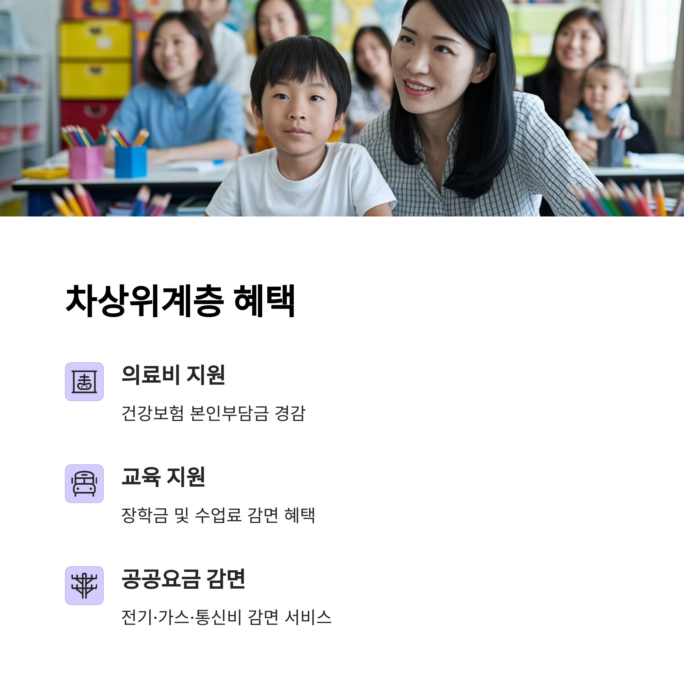 A4. 차상위계층의 가장 큰 혜택은 의료비 지원(차상위 본인부담경감)과 공공요금 감면(통신, 전기, 가스 등)입니다. 또한 대학생의 경우 국가장학금 전액 지원이 매우 큰 혜택입니다.