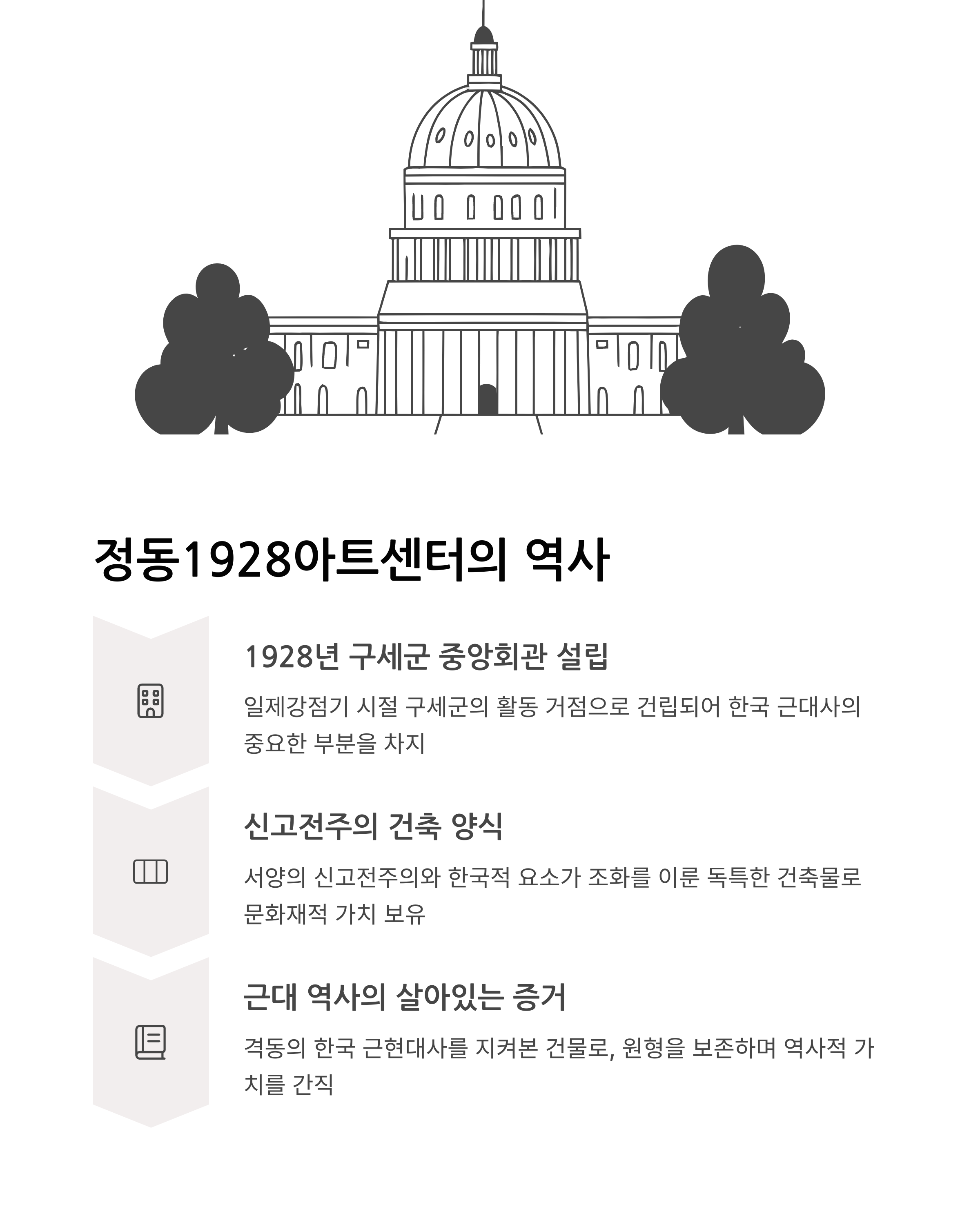 | 정동1928아트센터 | 근대 건축미와 문화 예술이 어우러진 복합 문화공간입니다. |