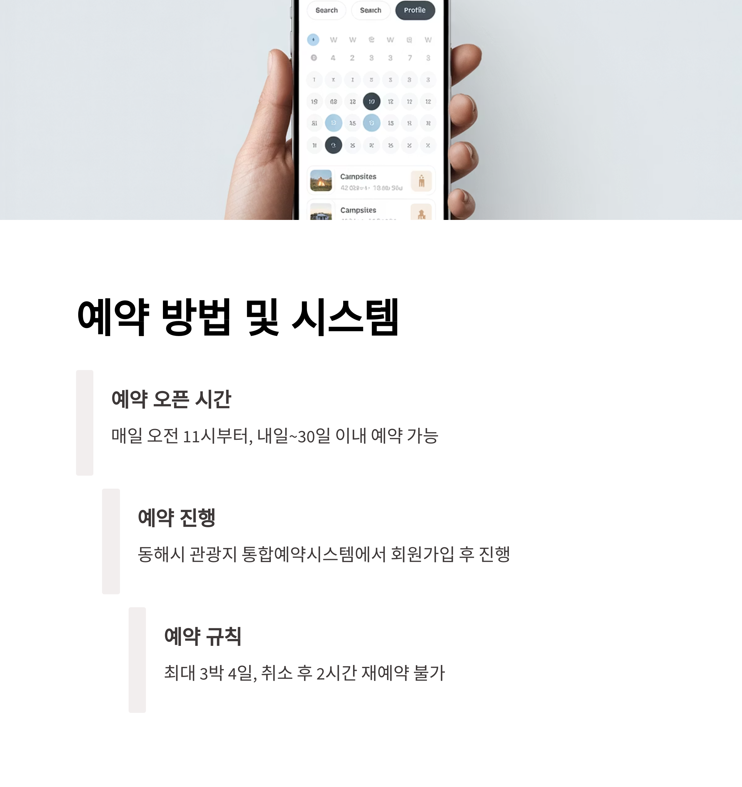 - 주변 관광: 무릉계곡, 추암 촛대바위, 묵호항 등
