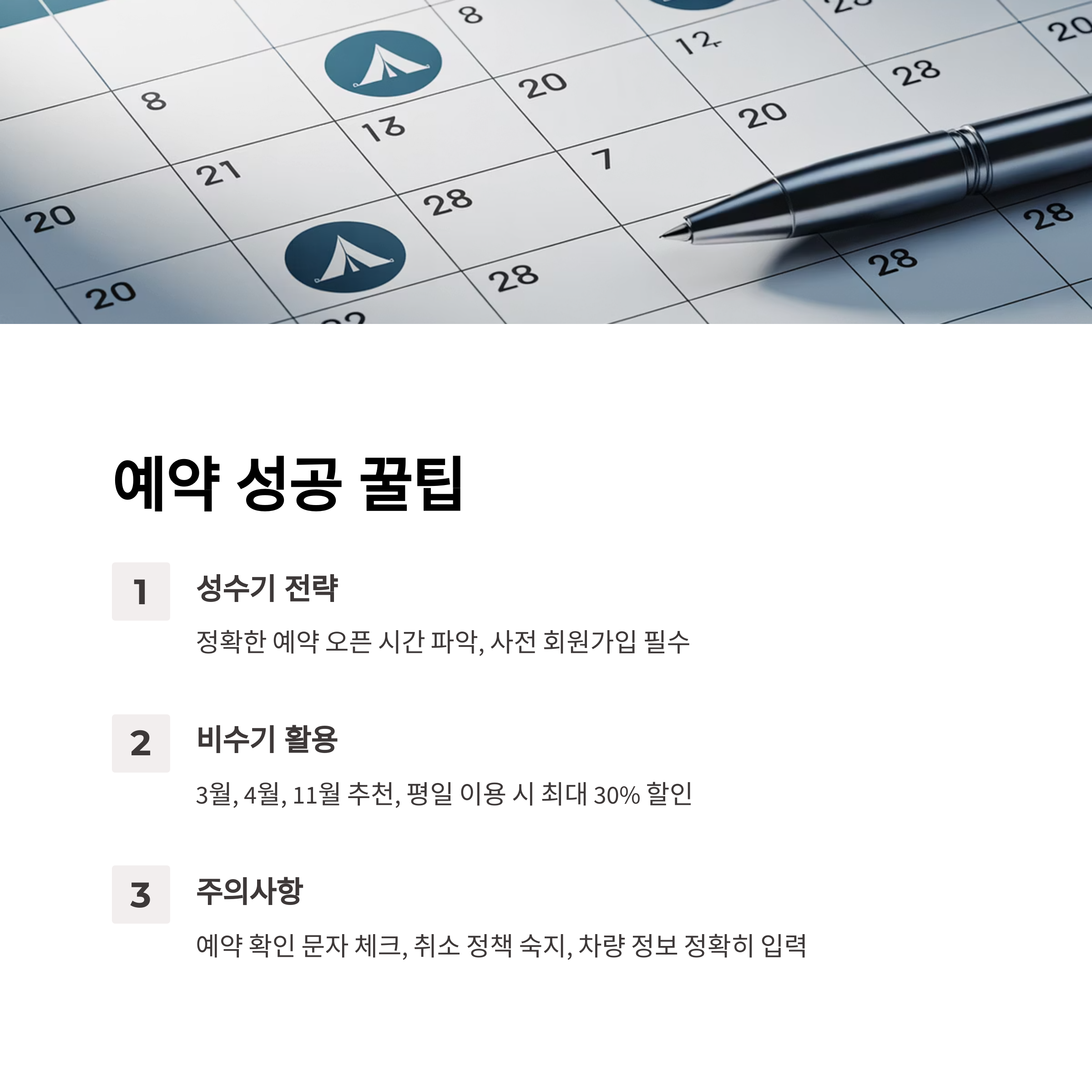 - 성수기 대비: 최소 1개월 전 예약 필수