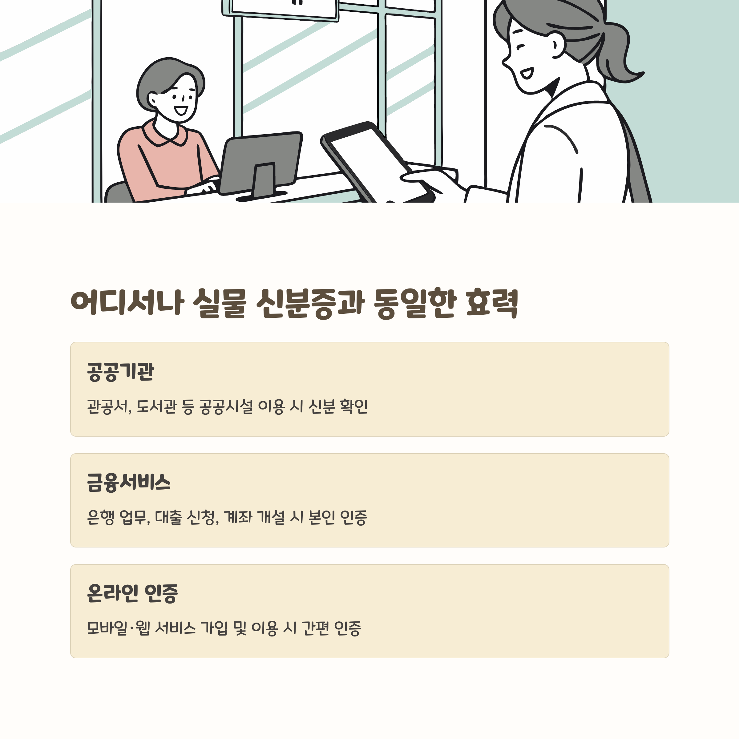 - 은행: 계좌 개설, 카드 발급, 대출 신청 등 금융 업무 시 신원 확인