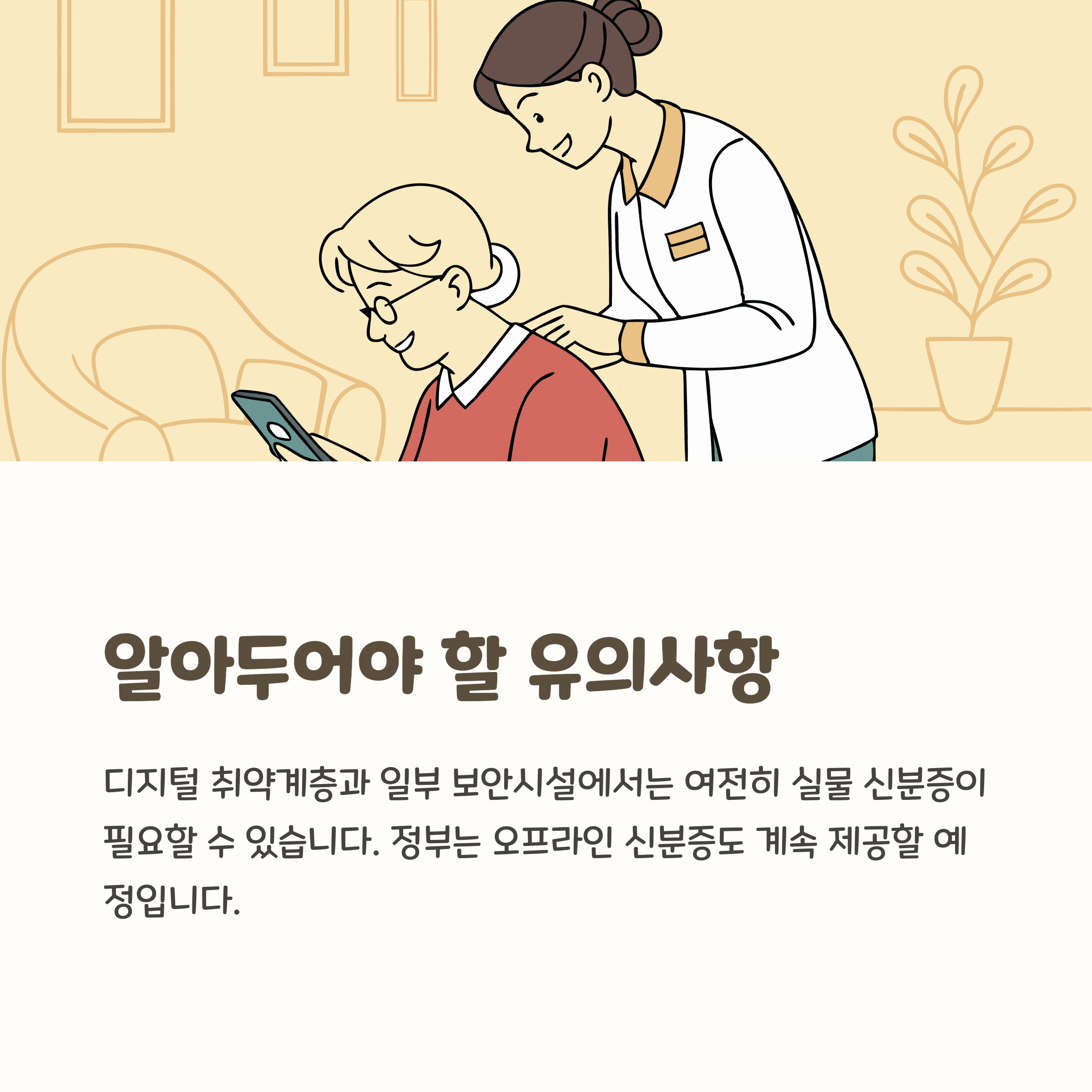 - 법적 절차: 법원 출석, 부동산 거래 등 중요한 법적 절차에서는 여전히 실물 신분증이 요구될 수 있습니다.