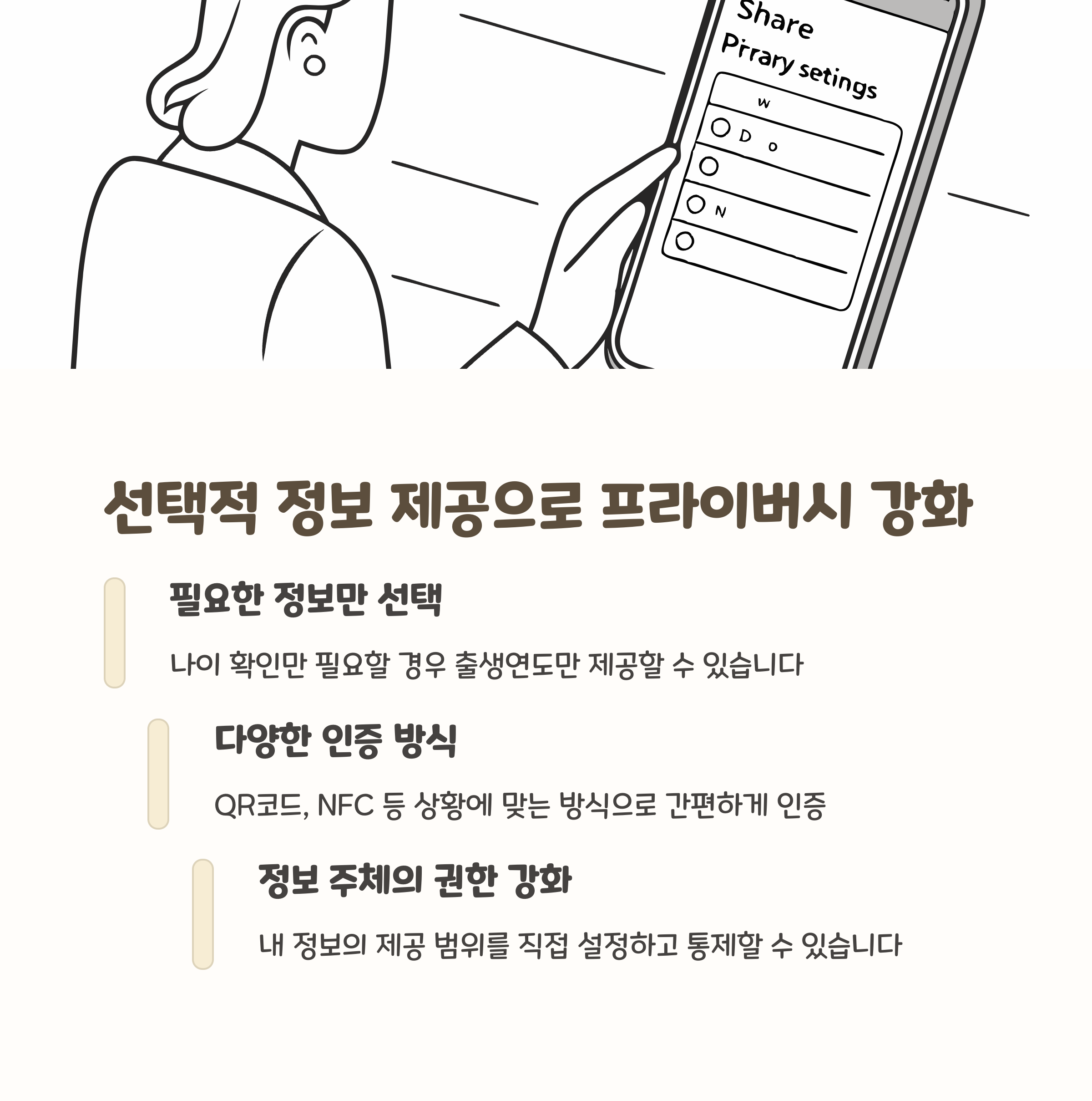 - 선택적 정보 제공: 필요한 정보만 선택적으로 제공하여 개인정보 보호 강화