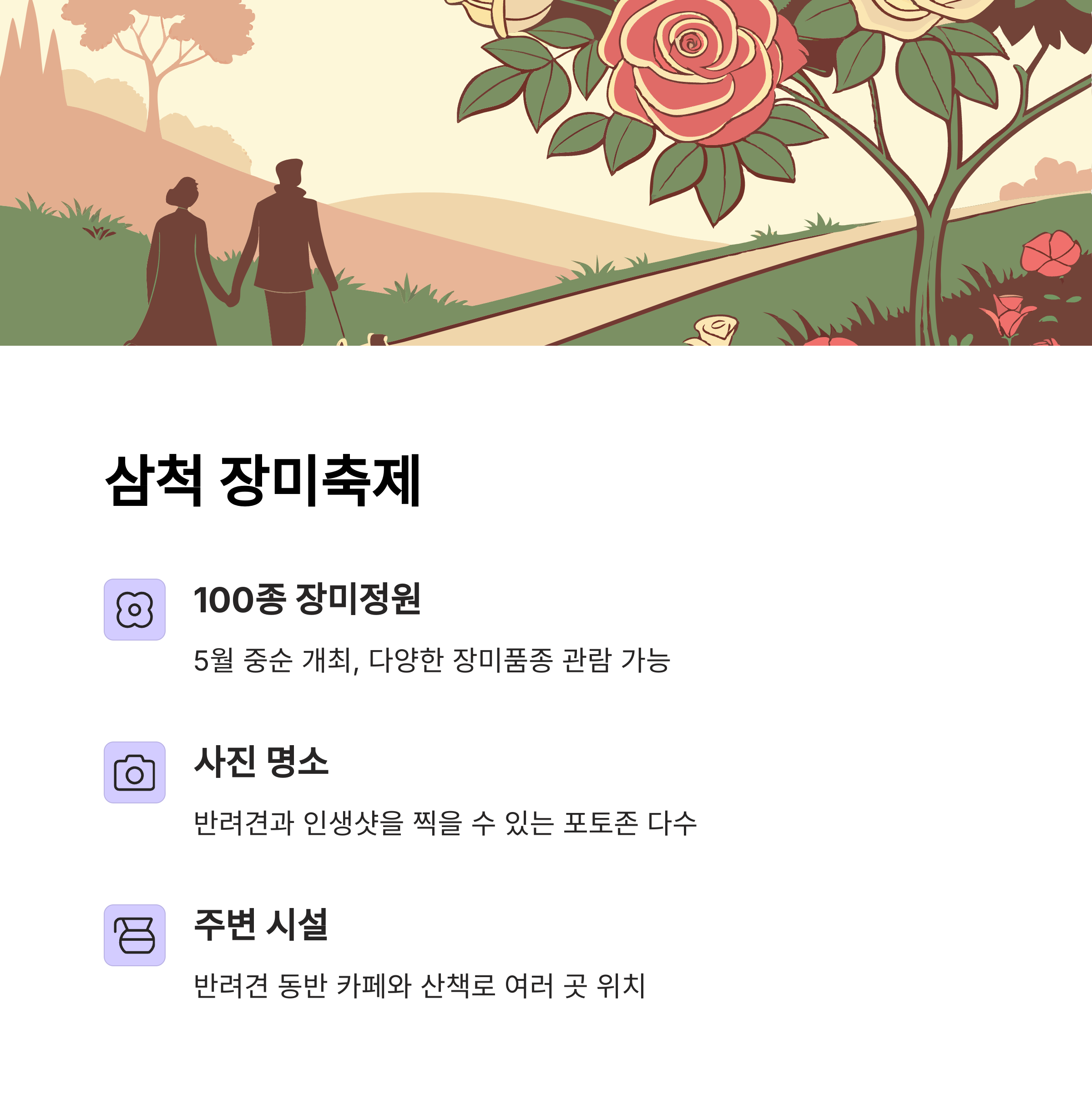 2025년 삼척 장미축제에서는 '반려견과 함께하는 장미 산책' 이벤트가 진행됩니다. 반려견과 함께 지정된 코스를 완주하면 기념품을 증정하는 행사로, 주말 오전 11시에 진행됩니다.