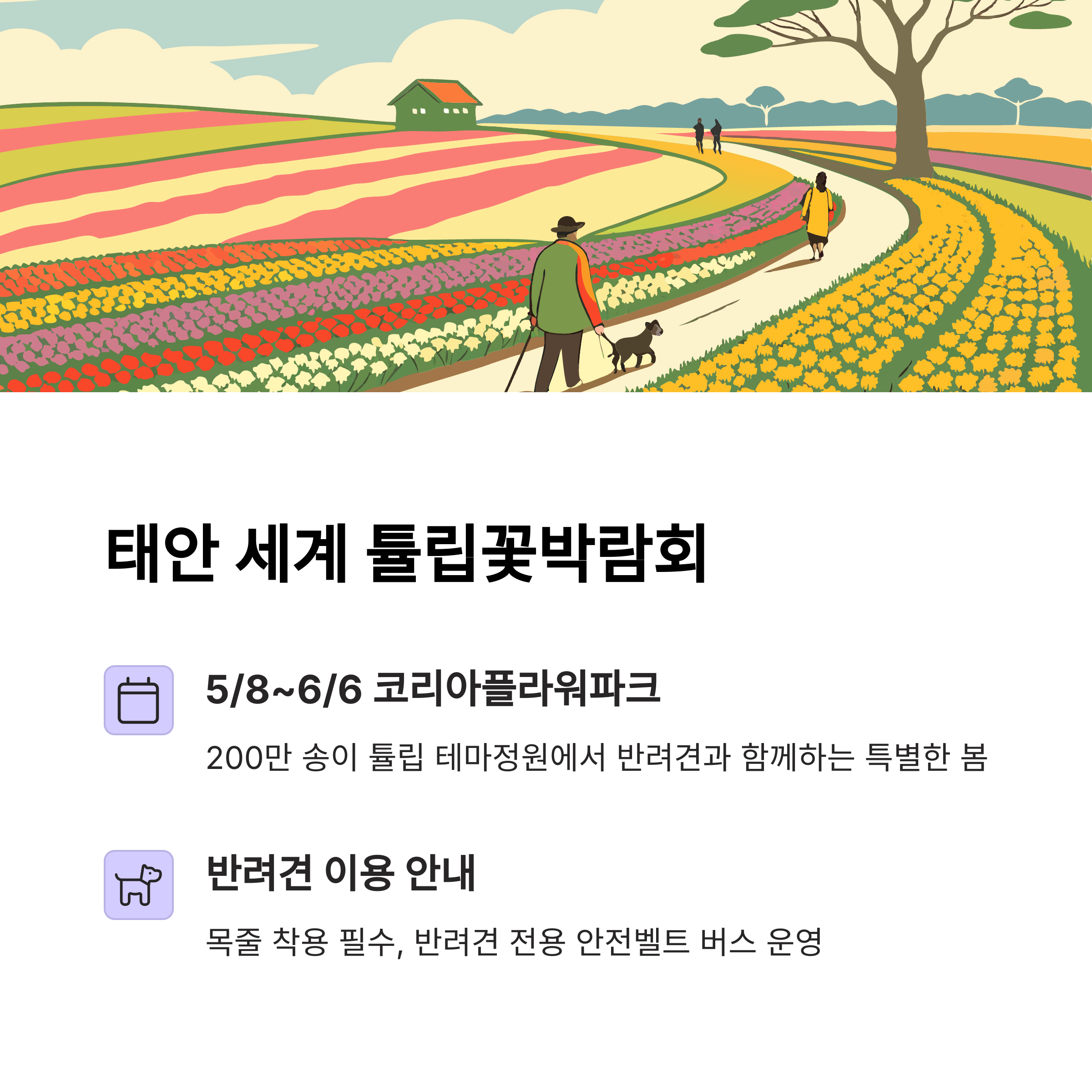 2025년 태안 세계 튤립 꽃박람회는 화려한 색채의 튤립이 만개하는 봄의 향연으로, 반려견과 함께 방문하기에 최적의 축제입니다. 특히 넓은 공간과 다채로운 꽃 정원은 반려견과 함께 산책하며 인생샷을 남기기에 완벽한 장소입니다.