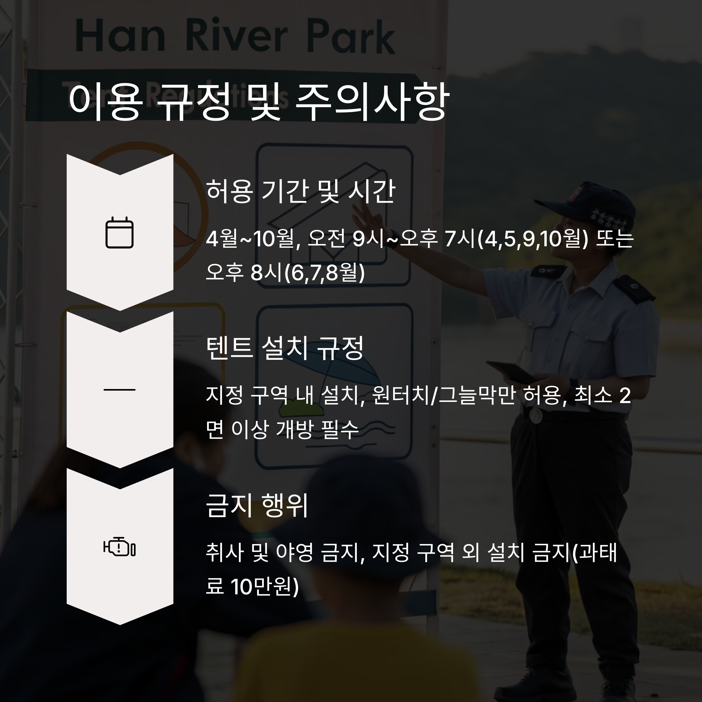 - 반납 시간 전에 한강공원 텐트 규정 시간(4~5월, 9~10월 19시, 6~8월 20시)이 종료될 수 있으니, 시간을 확인하고 텐트를 철거합니다.