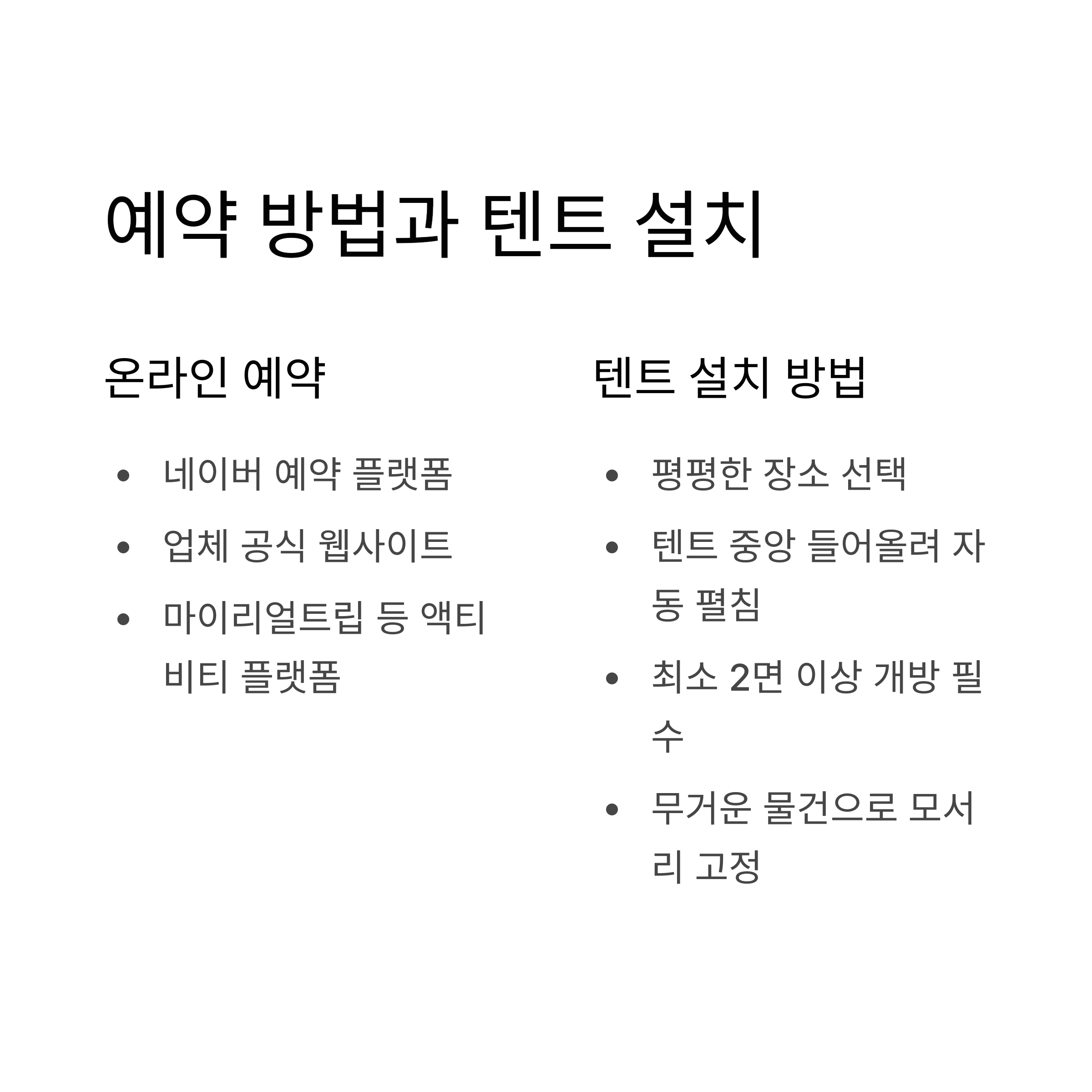 - 주의사항: 오후 7시까지 텐트를 철거해야 하므로, 충분한 시간을 두고 준비합니다.