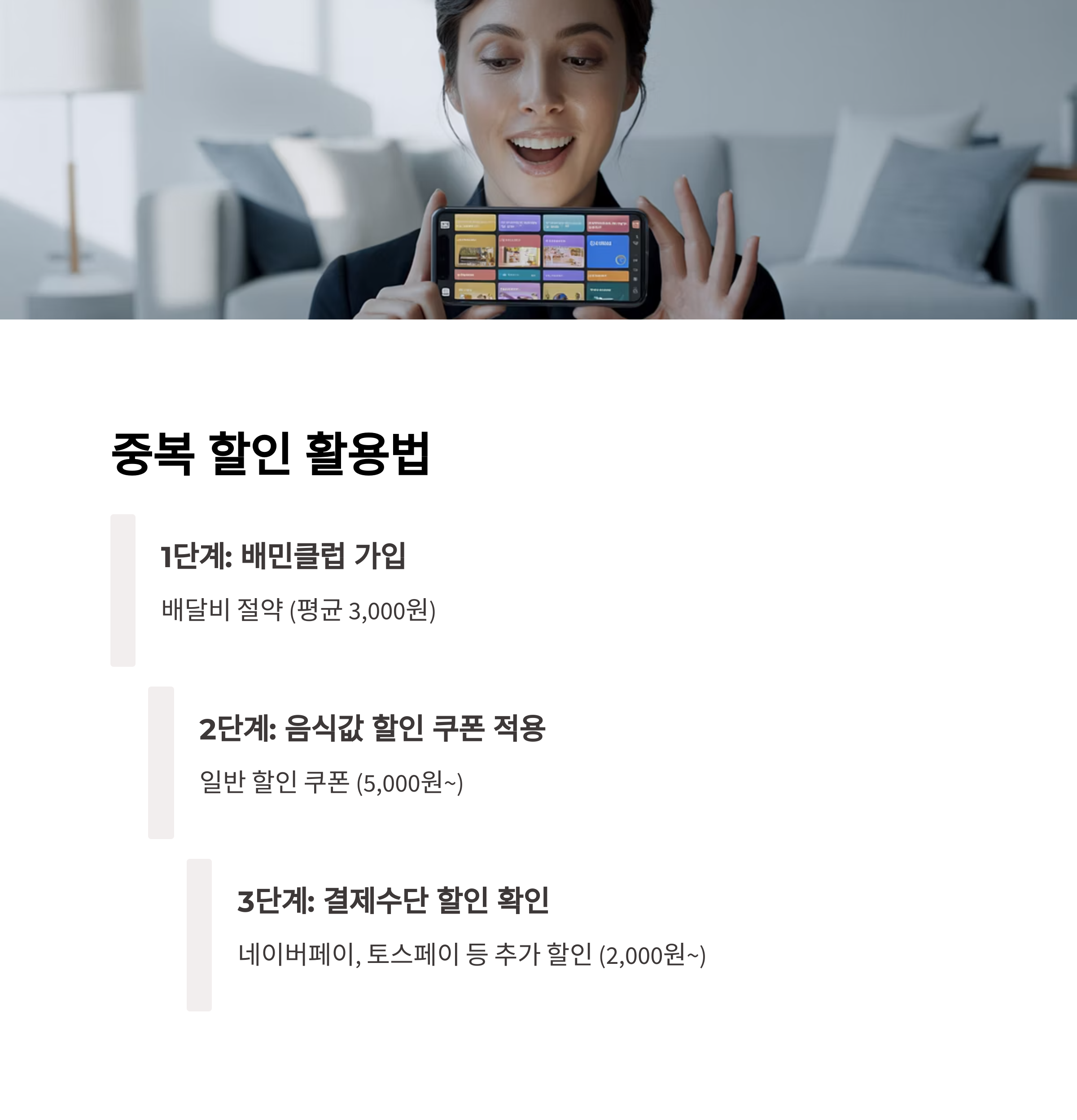 배민의 가장 큰 장점 중 하나는 다양한 할인 혜택을 중복으로 적용할 수 있다는 점입니다. 올바른 조합을 통해 한 번의 주문에서도 상당한 금액을 절약할 수 있습니다.
