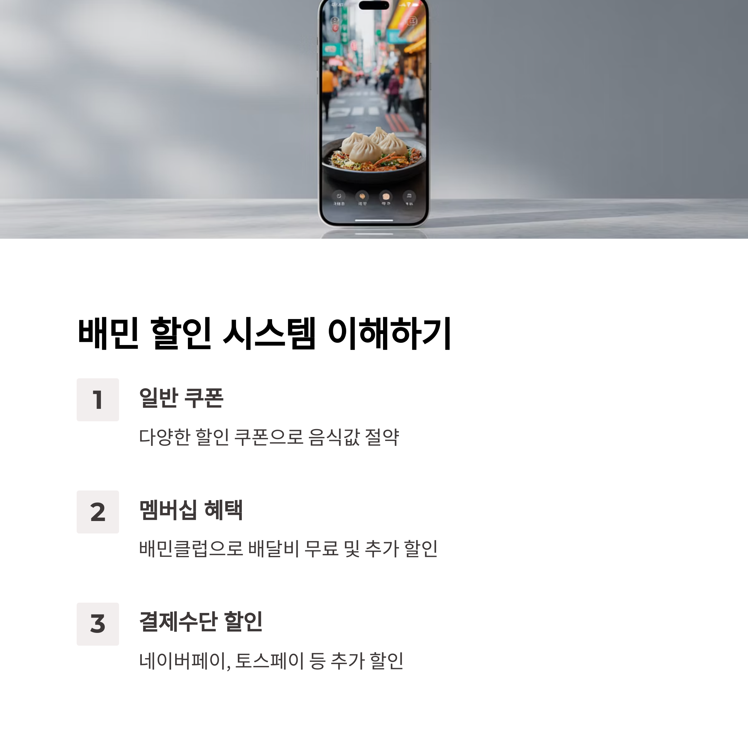 배민의 할인 시스템은 크게 일반 쿠폰, 멤버십 혜택, 결제수단 할인, 첫주문 혜택으로 구분됩니다. 이들을 적절히 조합하면 한 번의 주문에서도 상당한 금액을 절약할 수 있습니다.