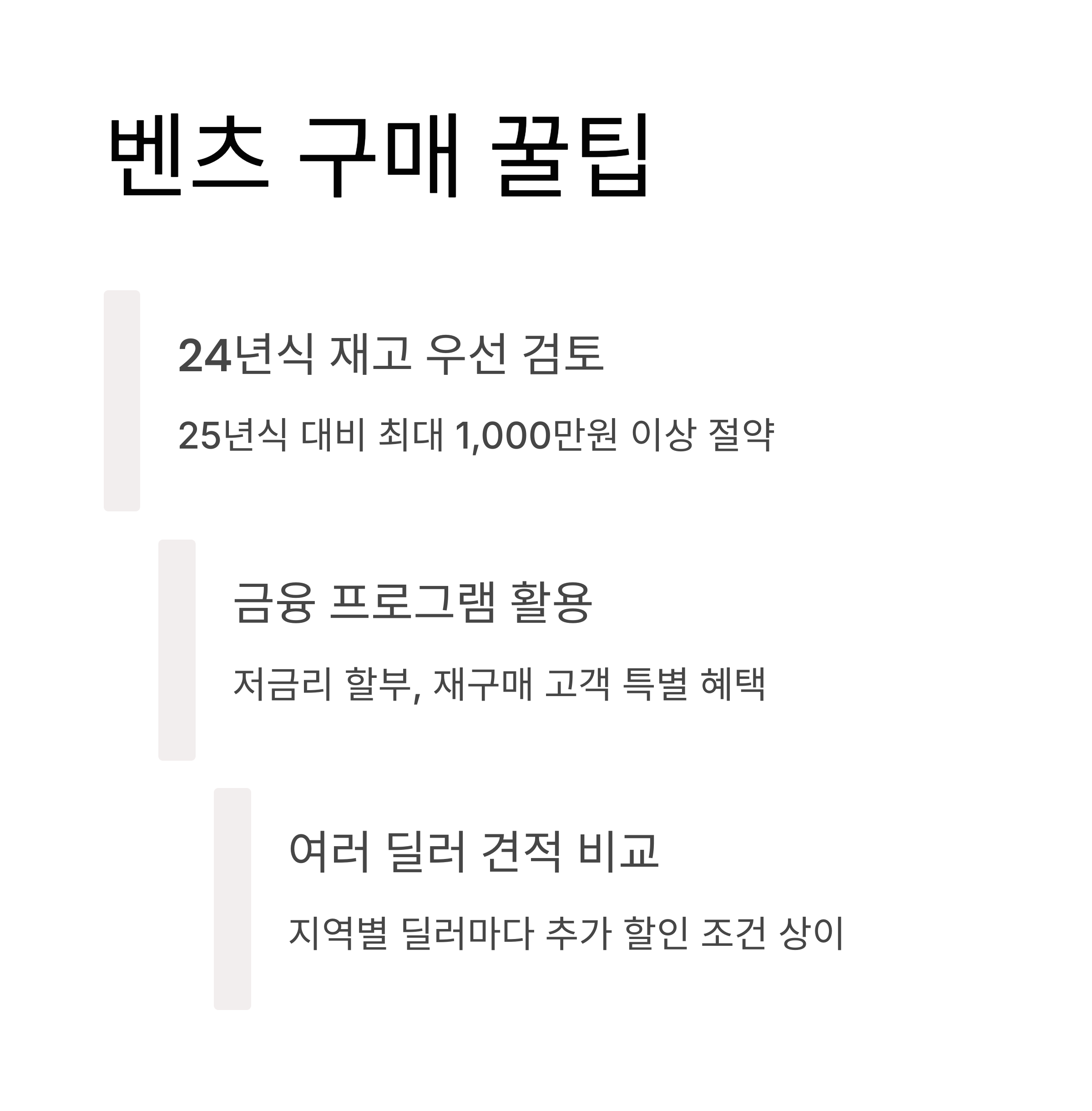 24년식과 25년식 간의 성능 차이는 미미하지만 가격 차이는 상당하므로, 실용적인 관점에서 24년식 재고차량을 우선 검토해볼 것을 권장합니다. 또한 벤츠 파이낸셜 서비스의 다양한 금융 프로그램을 활용하면 더욱 유리한 조건으로 구매할 수 있습니다.