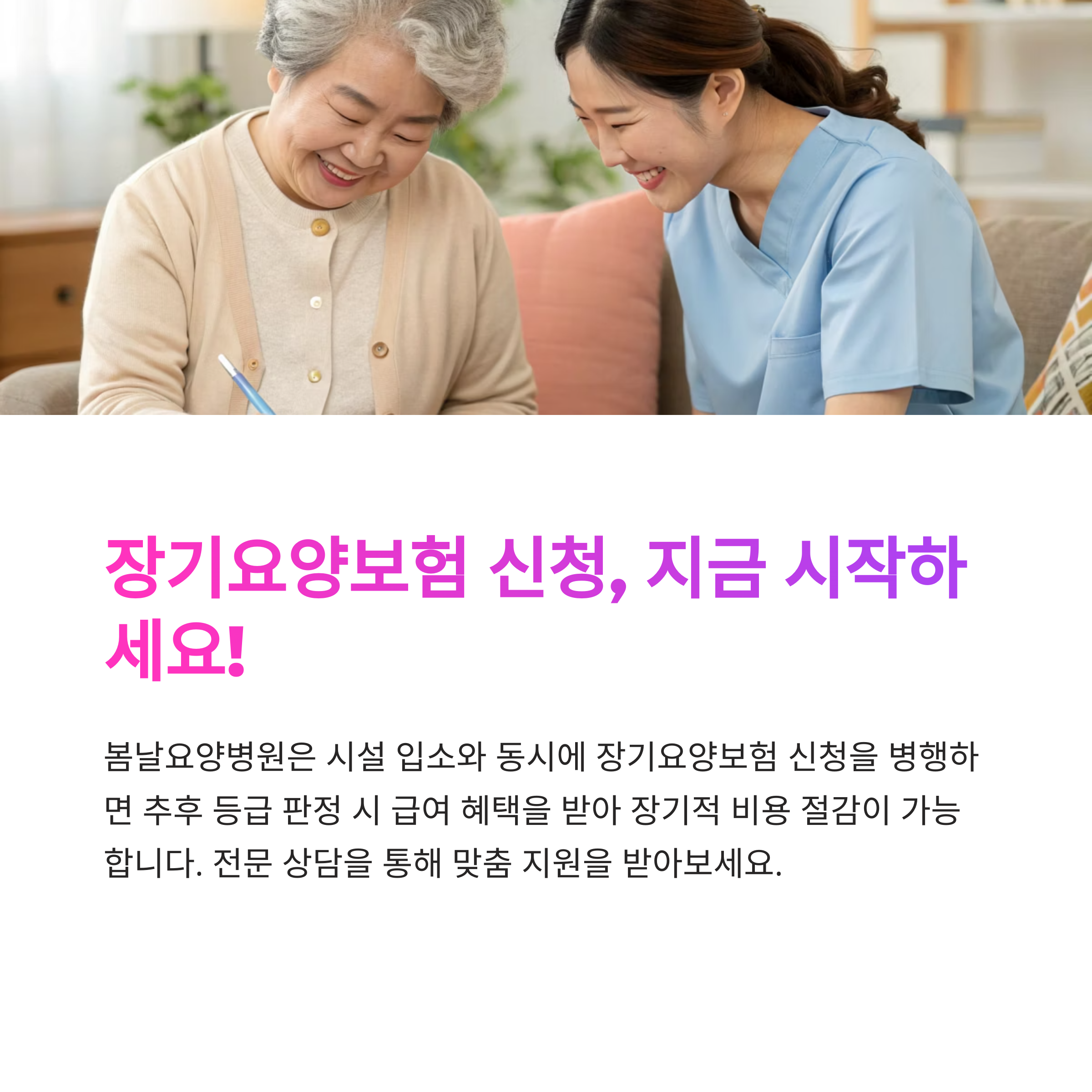 가장 중요한 것은 어르신이 편안하고 행복한 노후를 보낼 수 있는 환경을 제공하는 것입니다. 여러 시설을 비교하고 직접 방문하여 확인한 후 신중하게 결정하시기 바랍니다. 봄날요양병원과 같은 전문 노인요양시설은 장기요양보험 없이도 양질의 케어를 제공하여 어르신과 가족 모두에게 안정감을 줄 수 있습니다.