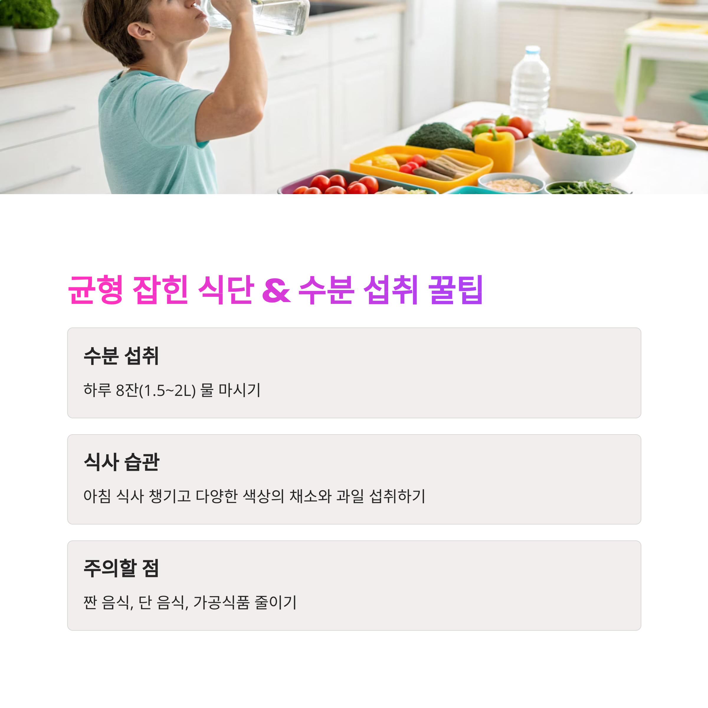 • 충분한 수분 섭취: 하루 약 2리터(8잔) 이상의 물을 마시는 것이 좋습니다. 물은 체내 독소 배출, 영양소 운반, 세포 기능 유지에 중요합니다.