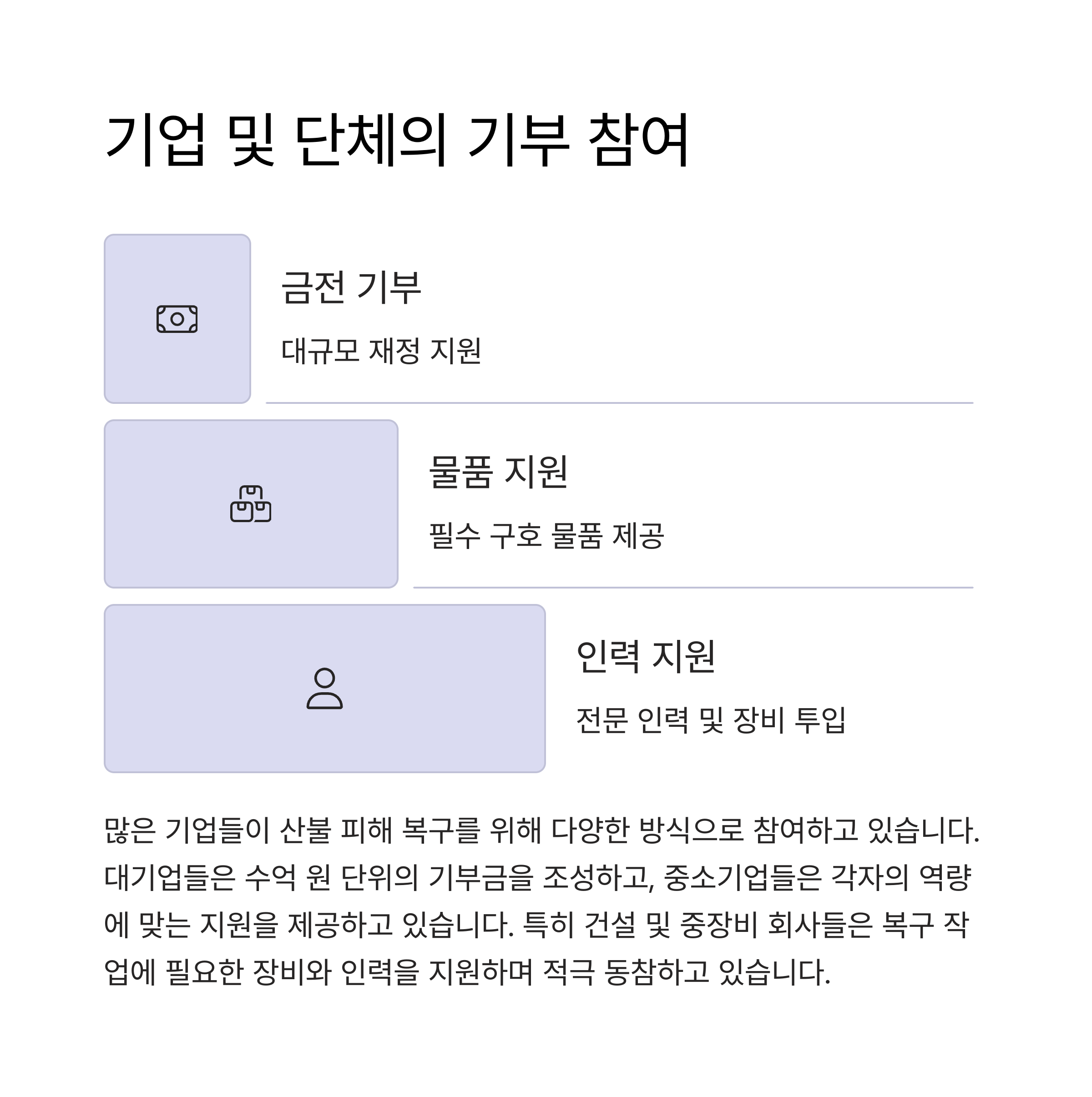 네이버 해피빈과 카카오 같이가치 같은 온라인 플랫폼은 기부 방식의 다양화를 이끌고 있습니다. 해피빈에서는 콩 적립금과 현금 기부를 통해 쉽게 참여할 수 있고, 카카오에서는 댓글만 달아도 기부에 동참할 수 있는 시스템이 마련되어 있습니다. 기업의 경우, 물품 기부 및 성금 후원을 통해 체계적인 지원이 가능하며, 코레일, 한국석유공사 등 주요 기업들이 이미 복구 활동에 참여하고 있습니다.