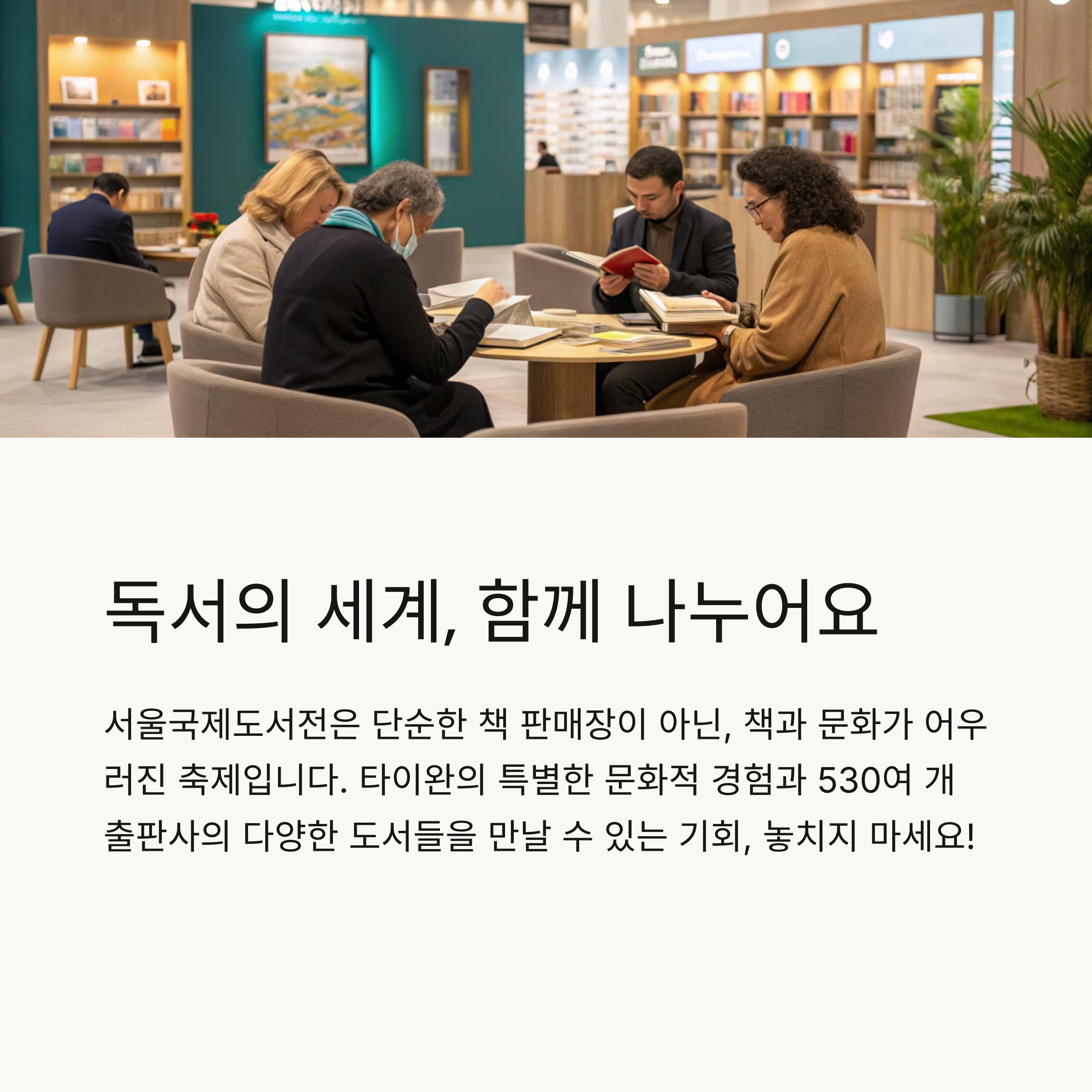 2025 서울국제도서전은 단순한 도서 판매장을 넘어 책과 문화가 어우러진 종합 축제입니다. 주빈국 타이완의 특별한 문화적 경험과 함께 국내외 530여 개 출판사가 선보이는 다양한 도서들을 만날 수 있는 절호의 기회입니다.