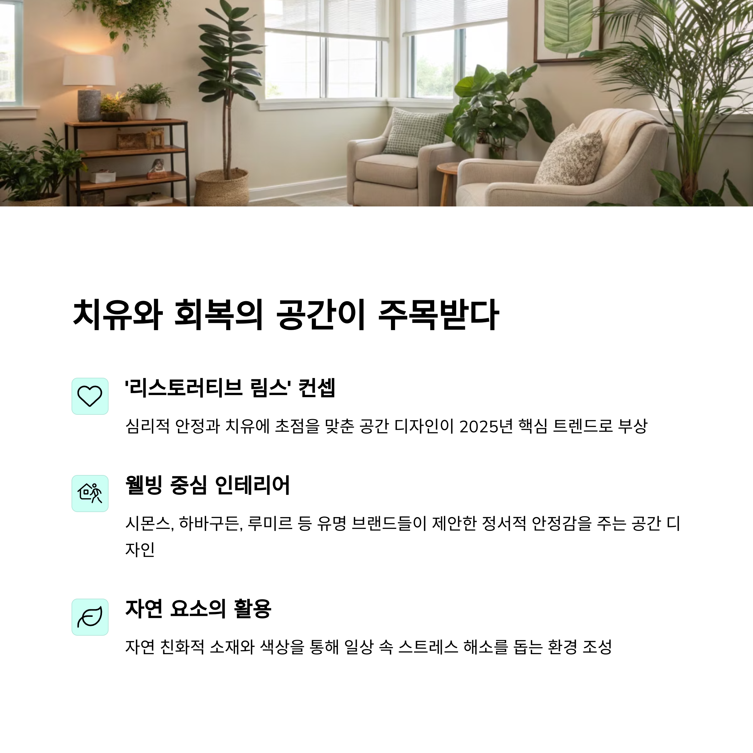 | 공간이 치유를 주는 역할을 강조한 테마 | 나만의 라이프스타일에 맞춘 인테리어 | 디자이너가 제안한 이상적인 주거 공간 |