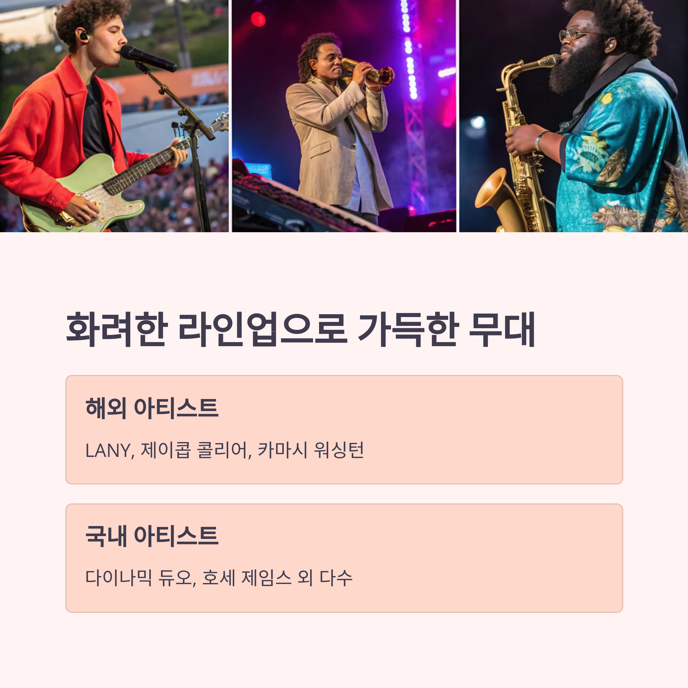 이 모든 준비를 마치셨다면, 이제 LANY, 제이콥 콜리어, 카마시 워싱턴, 썬더캣 등 세계적인 아티스트들의 공연과 함께하는 환상적인 음악 여행을 떠날 준비가 끝났습니다. 2025년 서울재즈페스티벌에서 잊지 못할 추억을 만드시길 바랍니다!