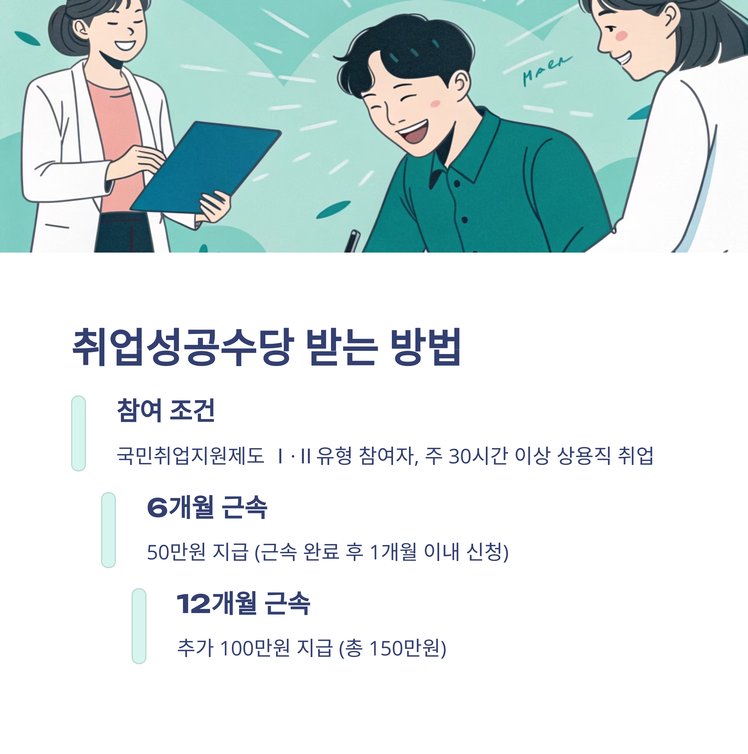 취업성공수당: 6개월 근속 50만원 + 12개월 근속 100만원