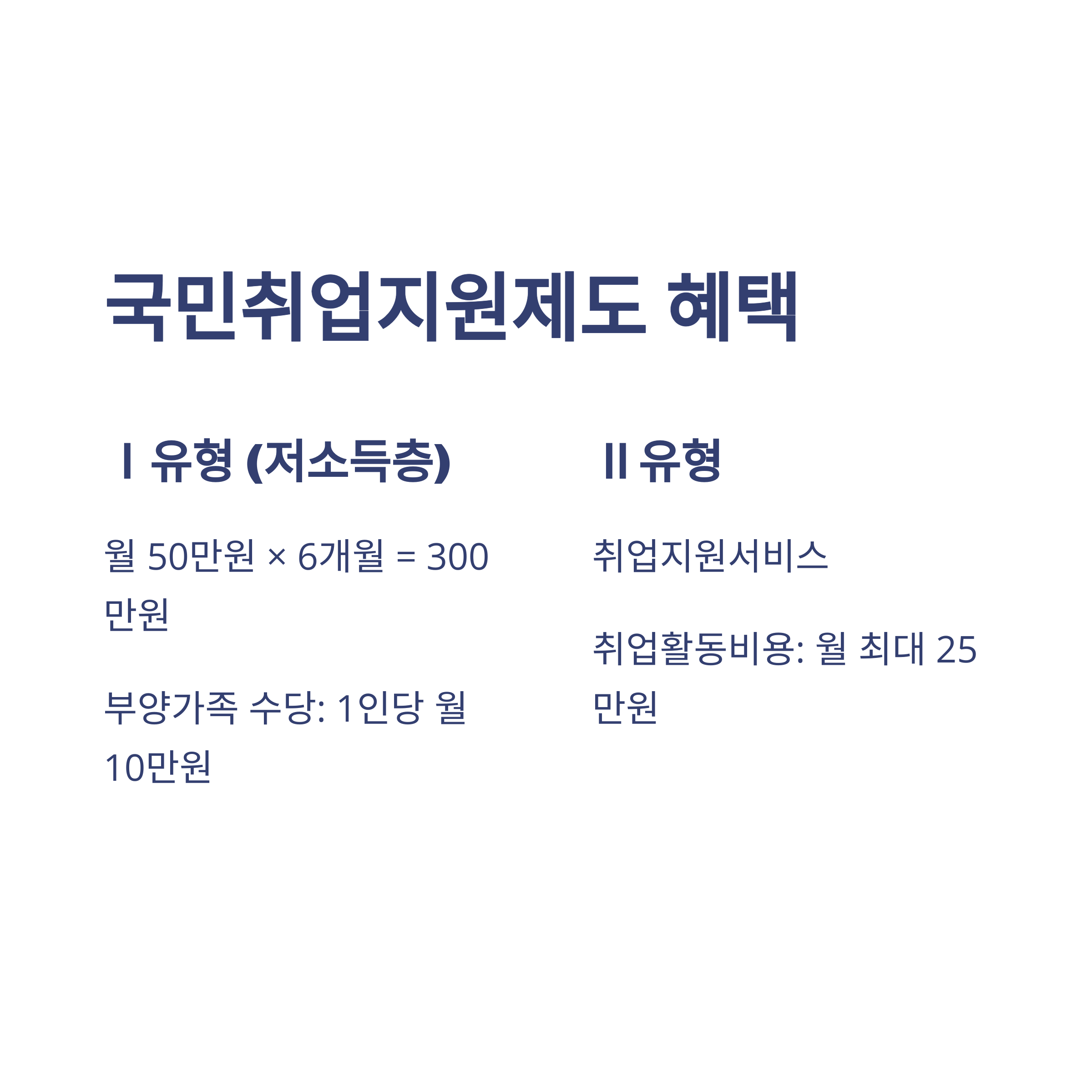 Ⅰ유형과 Ⅱ유형으로 나뉘어 운영되며, 각각 지원 대상과 내용이 다릅니다. 실업급여와는 중복 수급이 불가능하지만, 실업급여를 받을 수 없는 분들에게는 매우 유용한 제도입니다.
