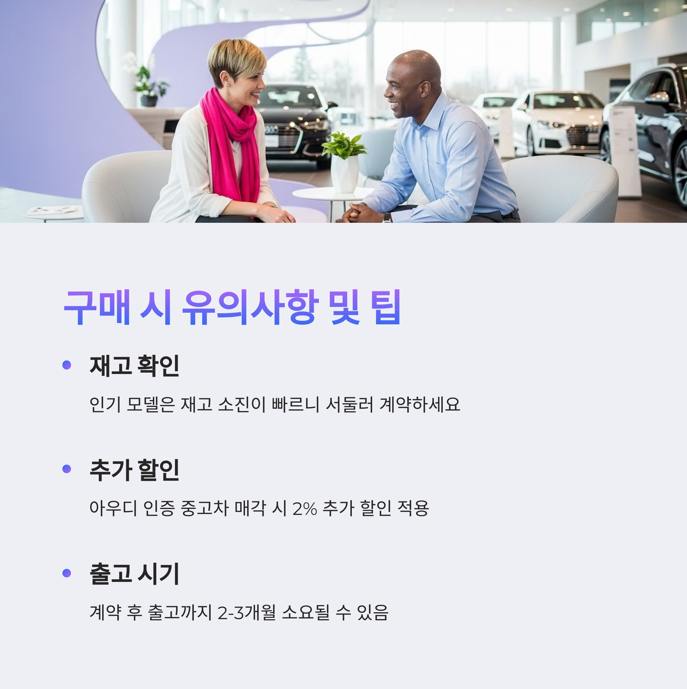 - 추가 할인: 아우디 인증 중고차 매각 시 2% 추가 할인이 적용됩니다.