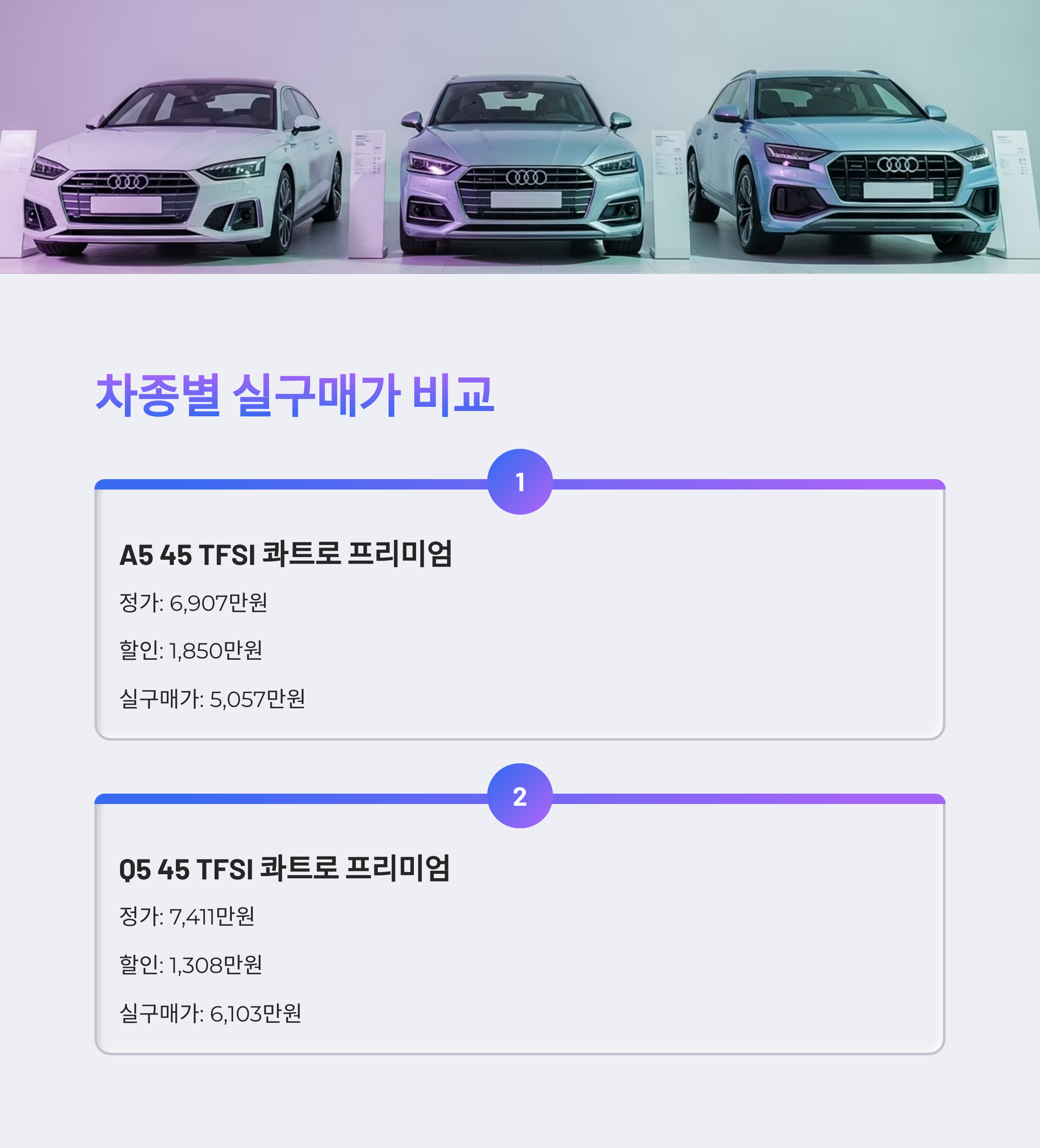 아우디 A5, Q5, Q8 세 차종의 7월 프로모션 적용 실구매가를 비교해보면 다음과 같습니다. 모든 가격은 최대 할인 적용 시 기준입니다.