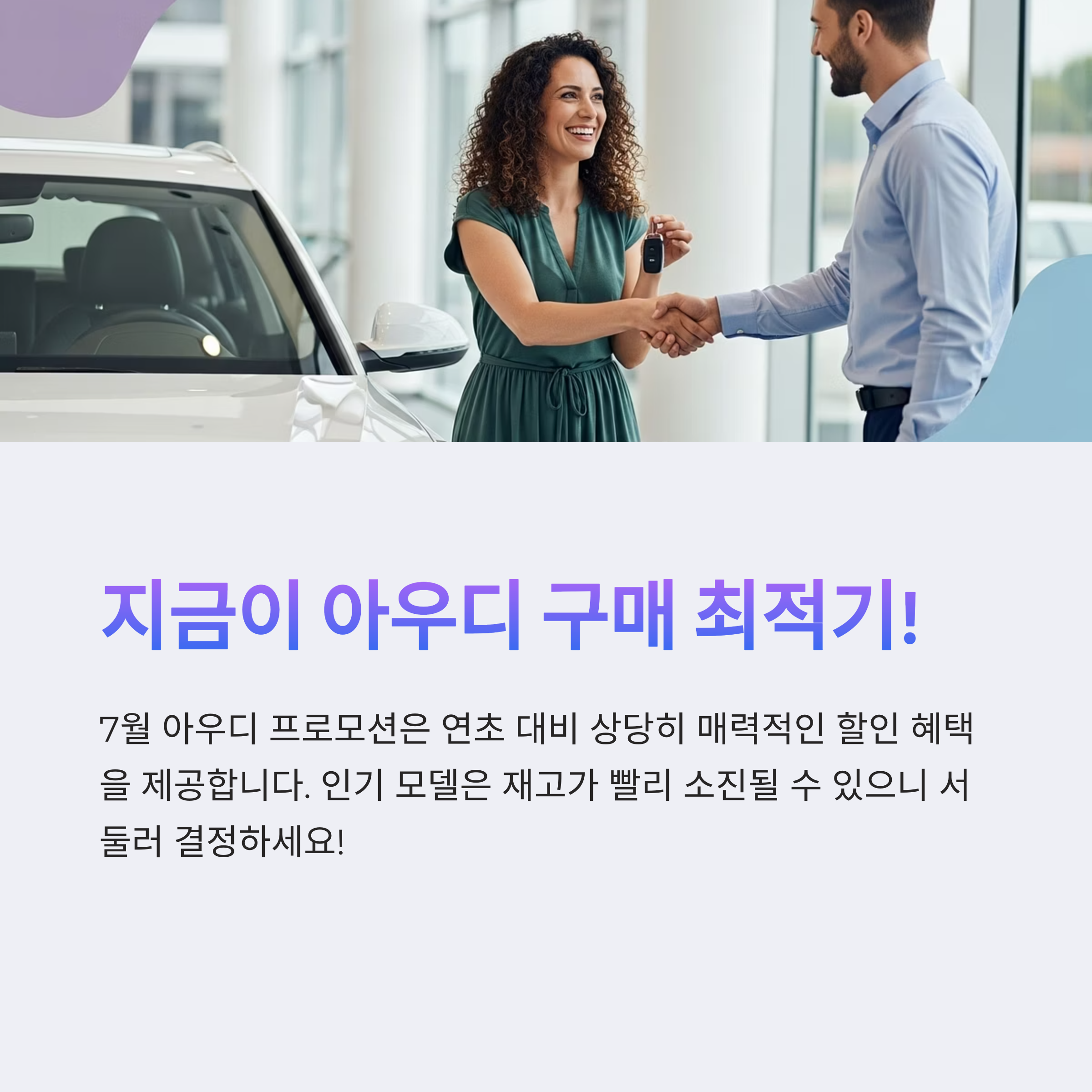 마지막으로 차량 구매는 큰 결정이니만큼 충분한 시승과 상담을 통해 자신에게 맞는 모델을 선택하시기 바랍니다. 아우디의 프리미엄 품질과 합리적인 가격으로 만족스러운 카 라이프를 즐기시길 바랍니다.