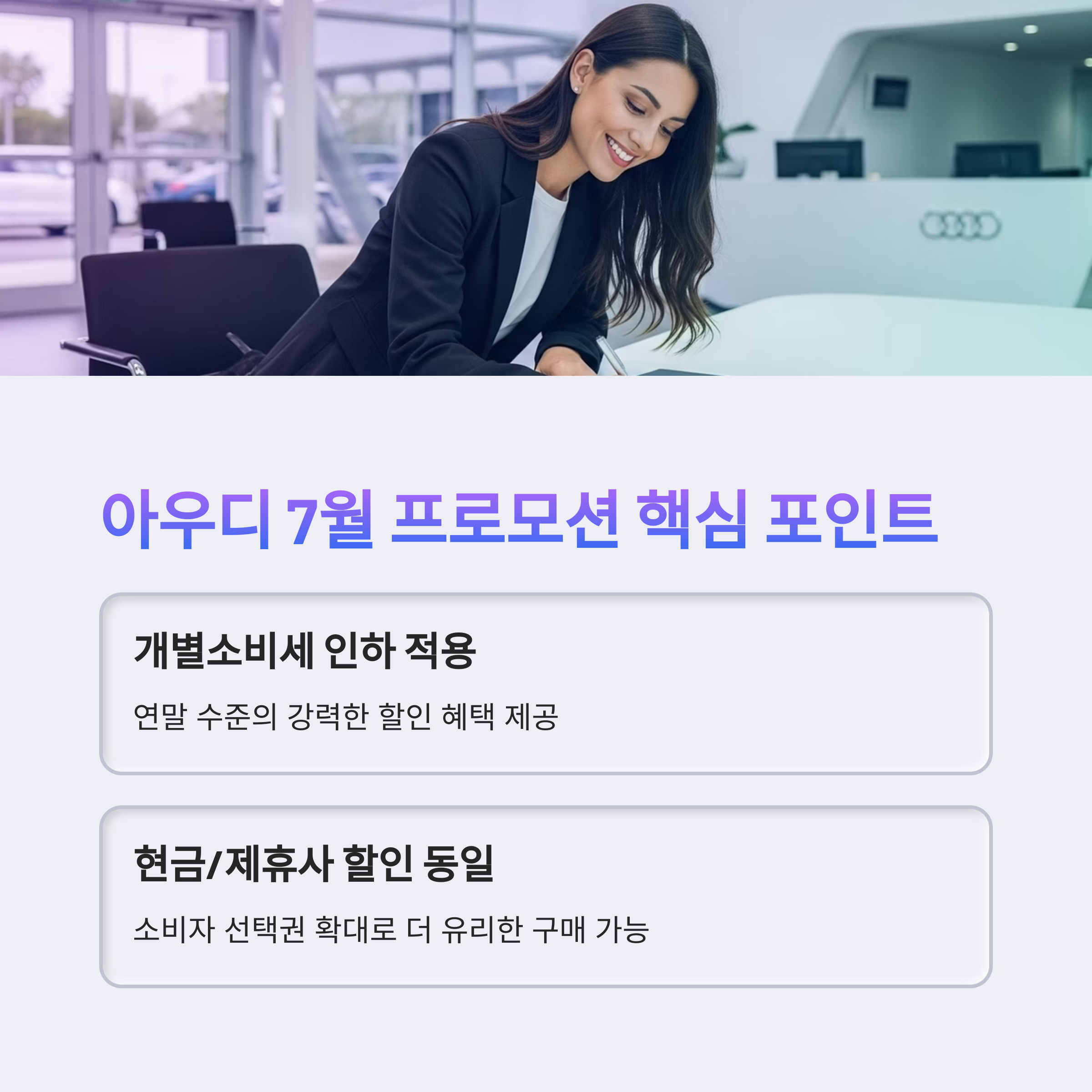 이번 프로모션의 주요 특징은 개별소비세 인하 조치와 함께 적용되어 연말 수준의 강력한 할인 혜택을 제공한다는 점입니다. 또한 현금 할인조건과 제휴사 할인조건이 거의 동일하게 맞춰져 소비자들의 선택권이 더욱 넓어졌습니다.