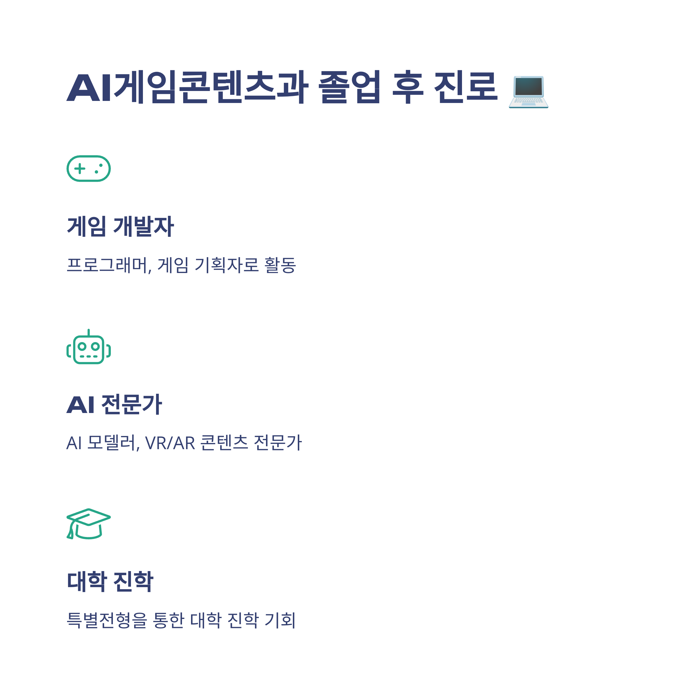 - 졸업 후 진로: 졸업 후에는 게임 개발자, 프로그래머, 게임 기획자, e스포츠 전문가, AI 모델러, VR/AR 콘텐츠 전문가 등 다양한 IT 분야로 진출할 수 있습니다. 또한, 우수 학생들을 위한 유수 기업과의 취업 연계 및 대학 진학(특별전형)의 길도 활짝 열려 있습니다.