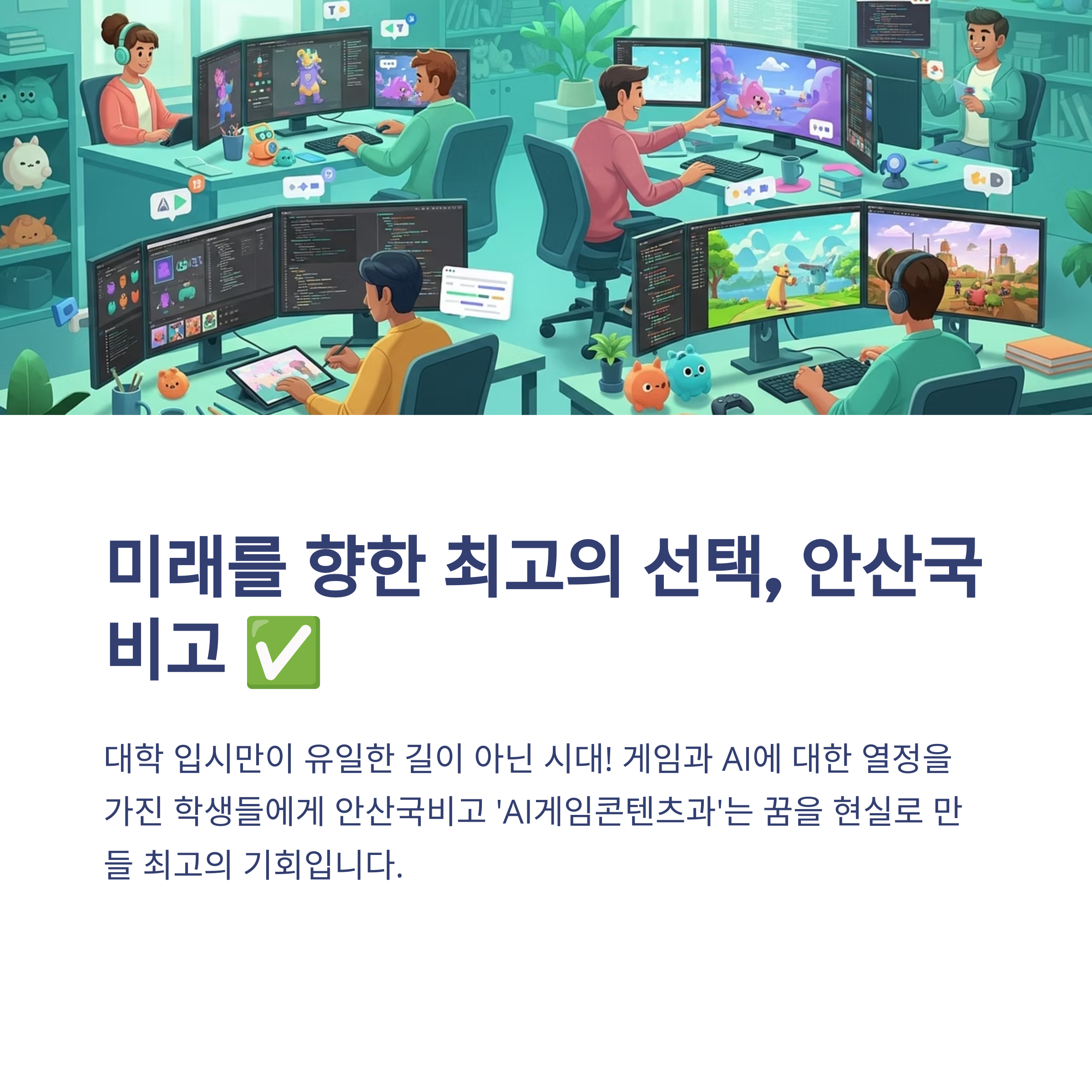 대학 입시만이 유일한 길이 아닌 시대입니다. 내가 무엇을 좋아하고, 무엇을 잘할 수 있는지 빨리 발견하고 그 분야의 전문가로 성장하는 것이 더 중요해졌습니다. 그런 의미에서 안산국제비즈니스고의 'AI게임콘텐츠과' 신설은 게임과 AI에 대한 열정을 가진 학생들에게 자신의 꿈을 현실로 만들 최고의 기회가 될 것입니다. 이 글을 참고하여 차근차근 입학을 준비하고, 2025년에는 안산국비고에서 미래 게임 산업의 주인공이 되기 위한 첫걸음을 내딛으시길 응원합니다.