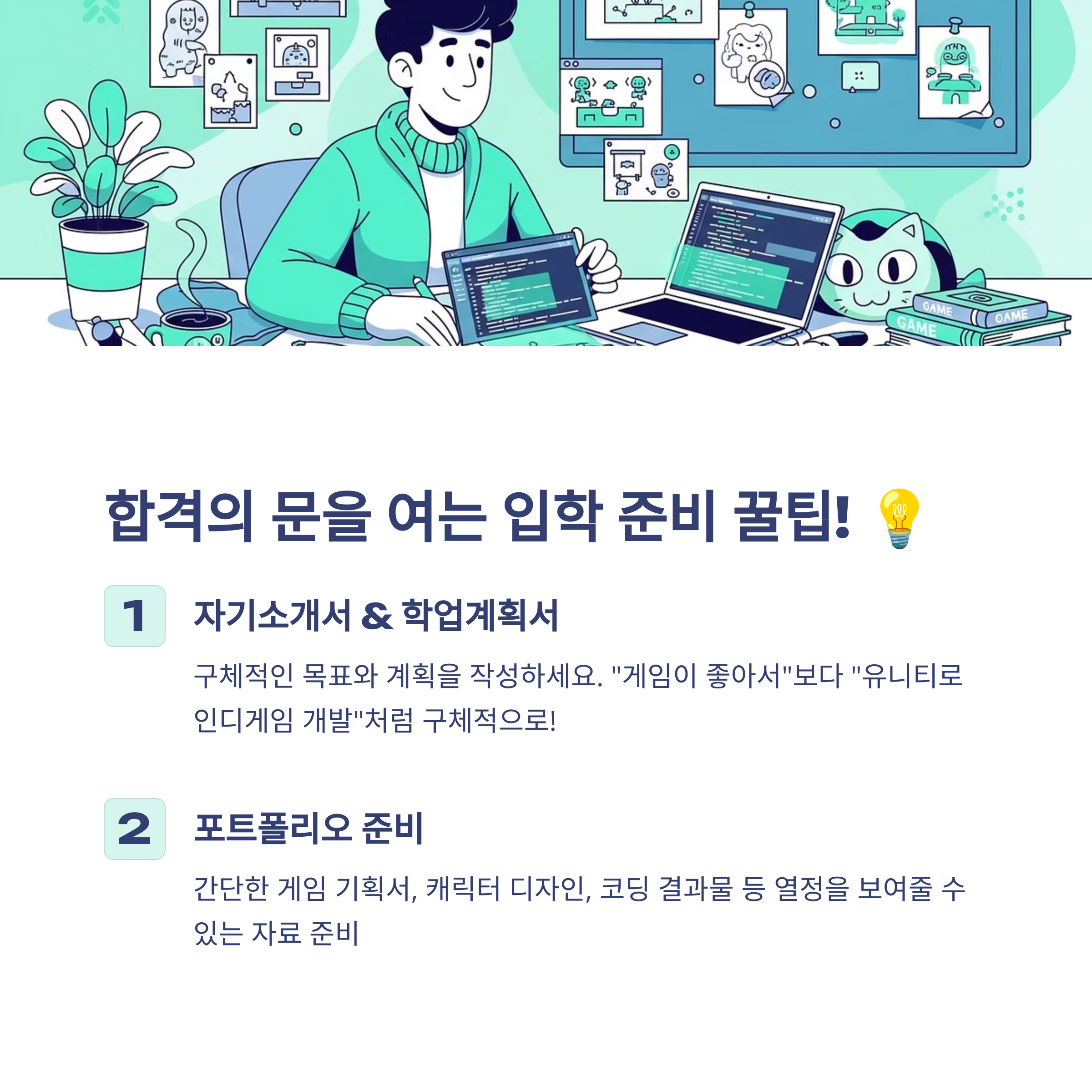 - 자기소개서 & 학업계획서: '왜' 이 학과에 오고 싶은지, '무엇을' 배우고 싶은지, '어떻게' 성장하고 싶은지를 구체적으로 작성해야 합니다. 막연히 '게임이 좋아서'가 아니라, '유니티 엔진을 배워 1인 인디게임을 개발해보고 싶다'와 같이 구체적인 목표를 보여주는 것이 좋습니다.