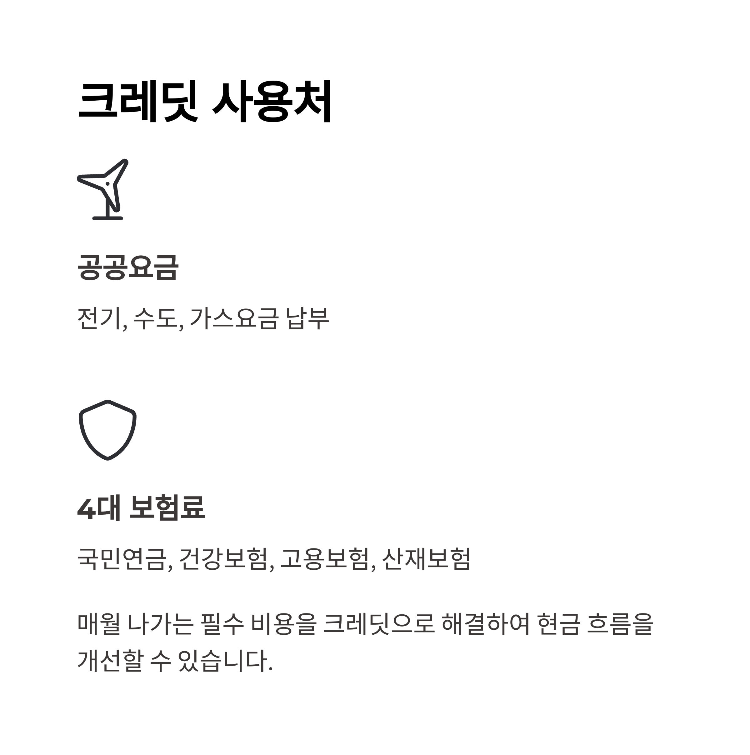 부담경감 크레딧은 소상공인의 고정 지출 항목인 공공요금 납부에 우선적으로 사용할 수 있습니다. 매월 나가는 필수 비용을 크레딧으로 해결하여 현금 흐름을 개선할 수 있습니다.