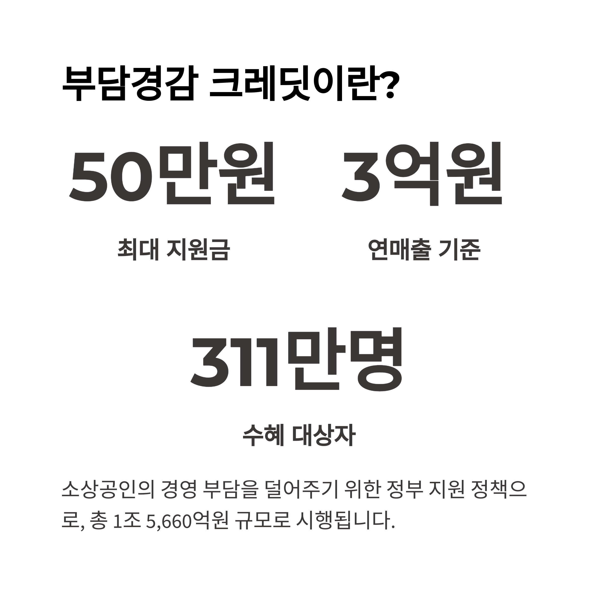 어려운 시기를 함께 극복하며, 더 밝은 미래를 향해 나아가는 모든 소상공인 분들의 성공을 진심으로 응원합니다. 부담경감 크레딧이 여러분의 사업에 실질적인 도움이 되기를 바랍니다.