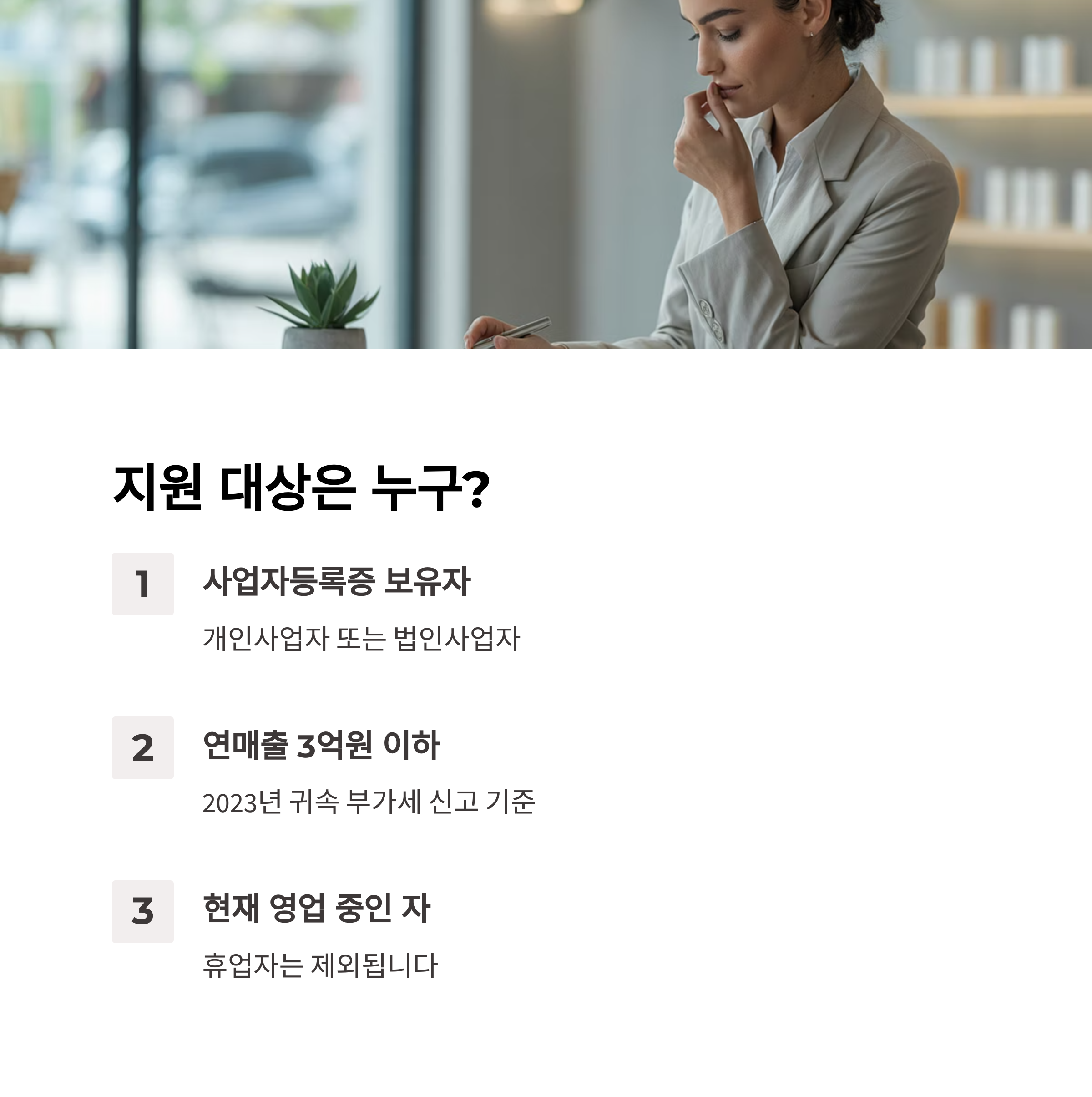 - 지원 대상: 연매출 3억원 이하 소상공인