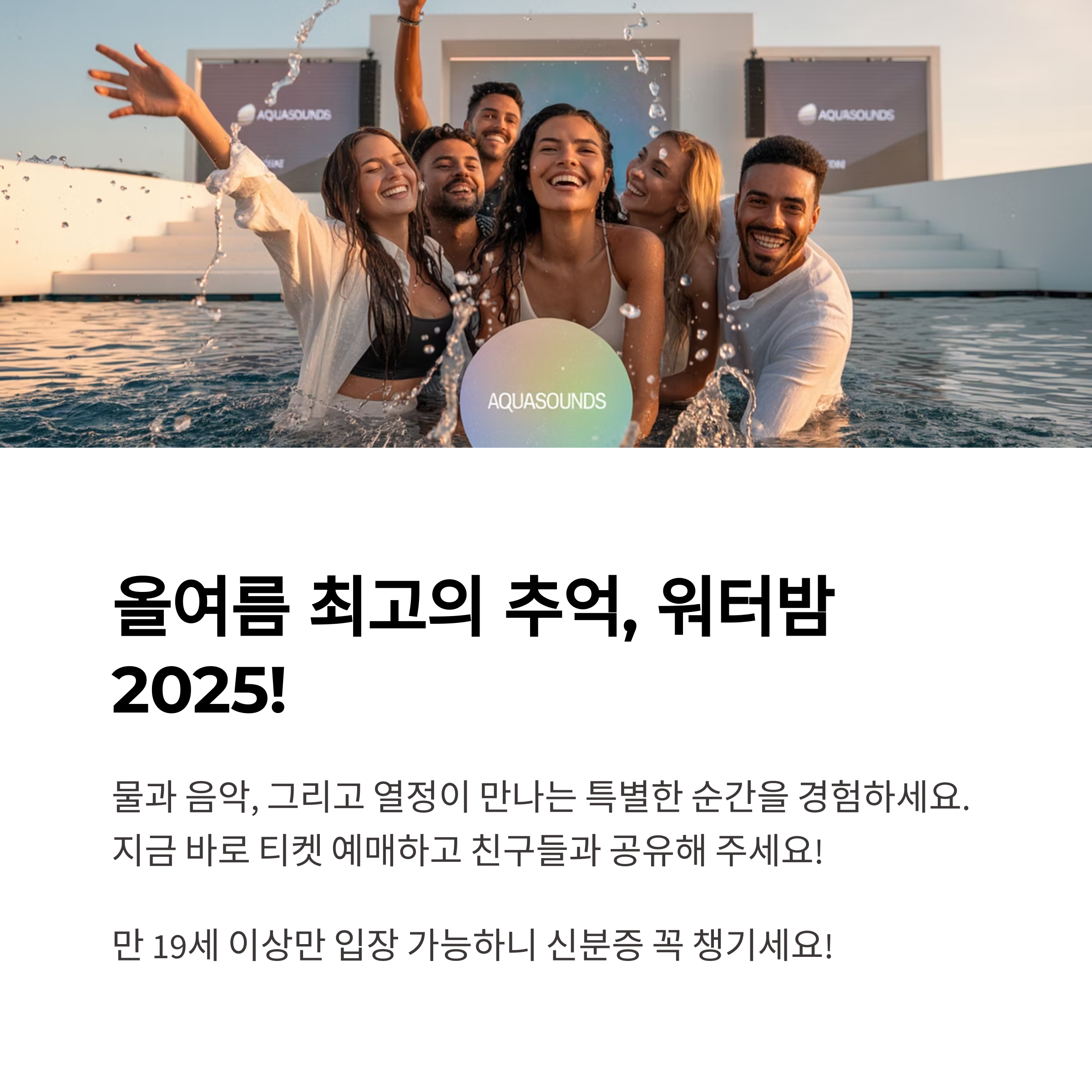 2025년 여름, 워터밤과 함께 시원하고 뜨거운 추억을 만들어 보세요. 물과 음악, 그리고 열정이 만나는 특별한 순간들이 여러분을 기다리고 있습니다. 지금 바로 티켓을 예매하고 올여름 최고의 페스티벌을 경험해 보시기 바랍니다!