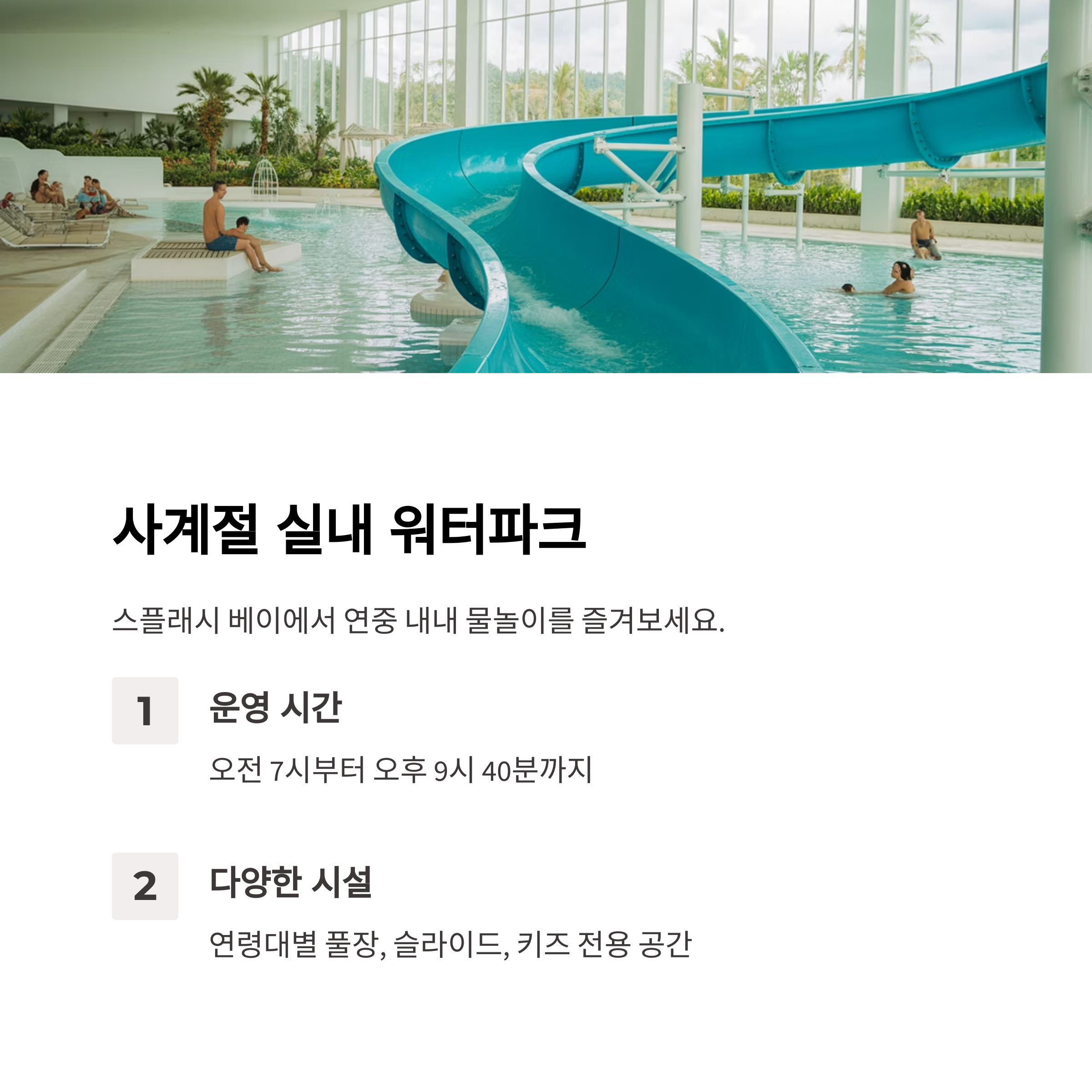 인스파이어 리조트의 실내 워터파크 '스플래시 베이'는 연중 내내 이용 가능한 실내 시설로, 다양한 연령대의 가족 구성원들이 모두 즐길 수 있는 다채로운 시설을 갖추고 있습니다. 성인과 어린이 모두를 위한 다양한 풀장과 슬라이드, 그리고 편안한 휴식 공간까지 완벽하게 조성되어 있습니다.