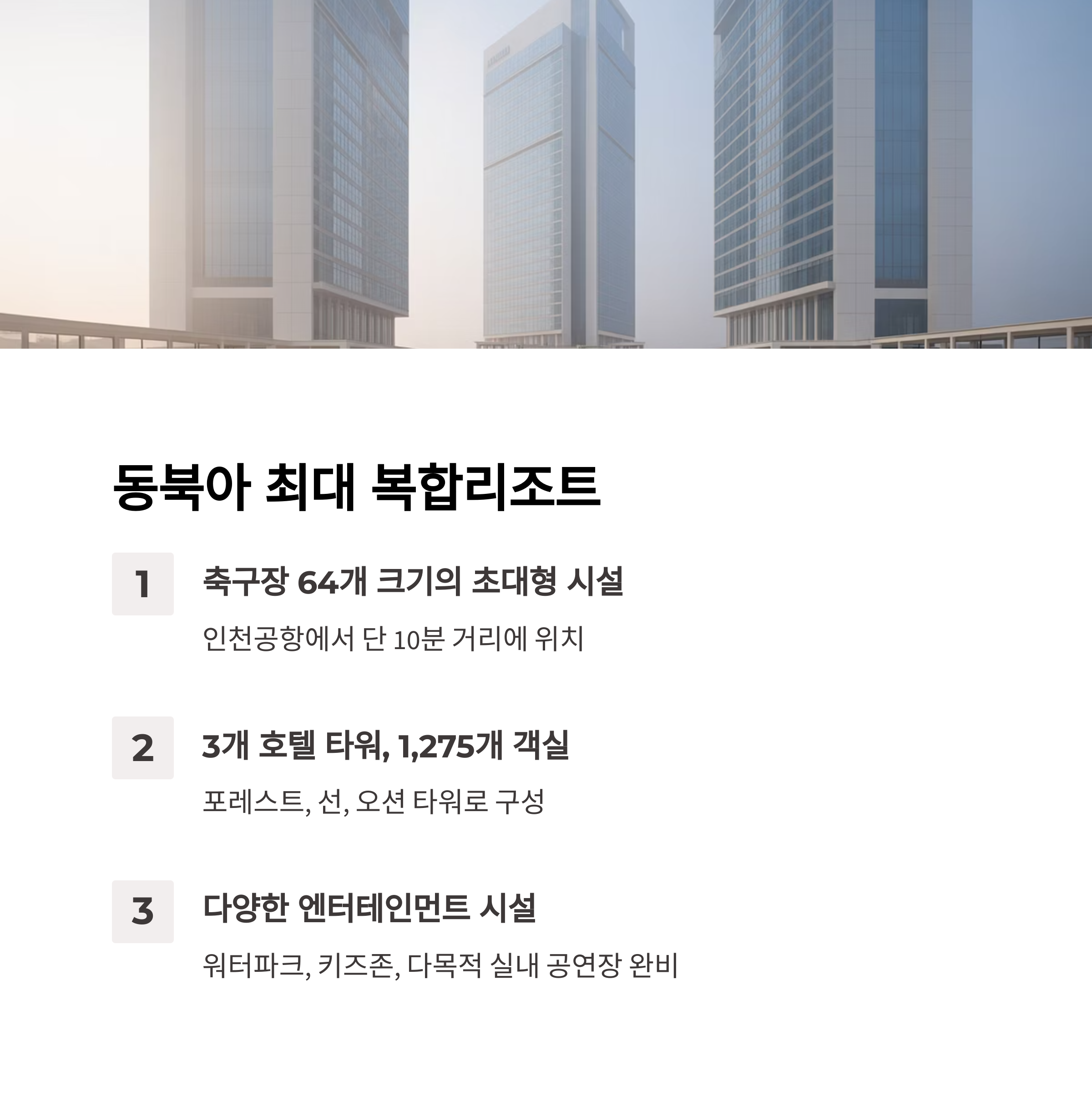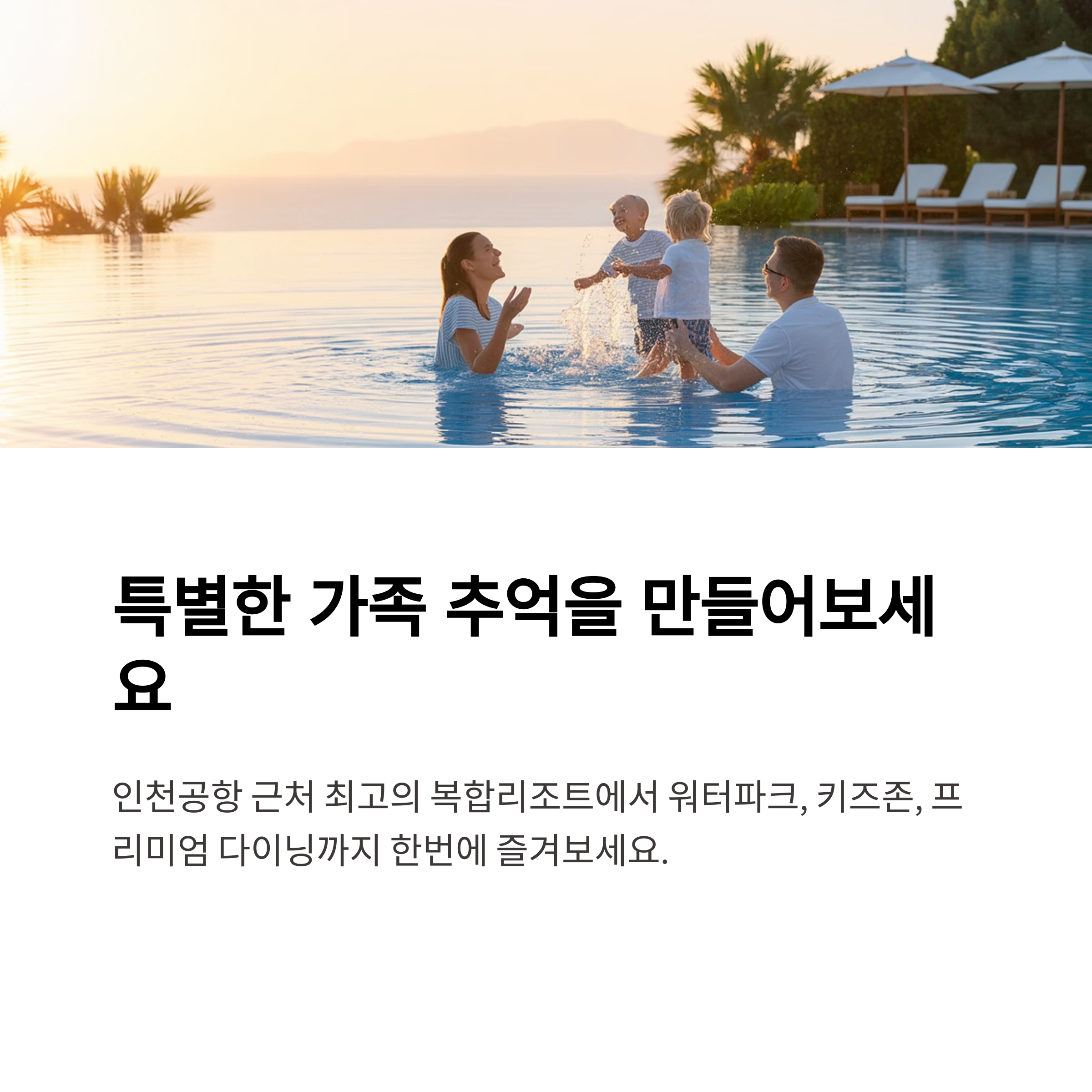 특히 인천국제공항에서 차로 단 10분 거리에 위치해 있어 접근성이 뛰어나며, 실내 워터파크 '스플래시 베이', 키즈존 '짱랜드', 다양한 레스토랑과 바, 그리고 국내 최초 다목적 실내 공연장인 '인스파이어 아레나'까지 갖춘 명실상부한 올인원 리조트입니다.