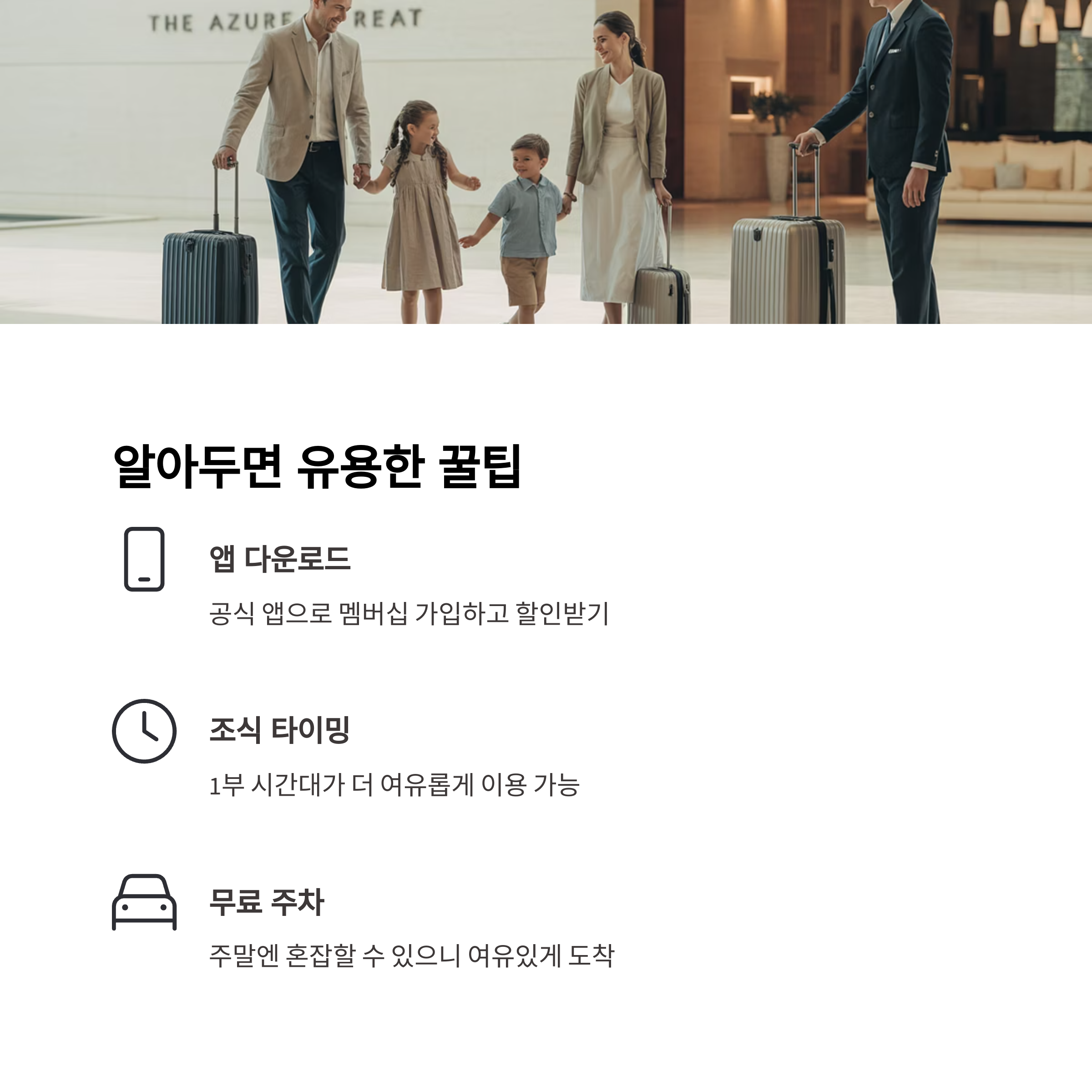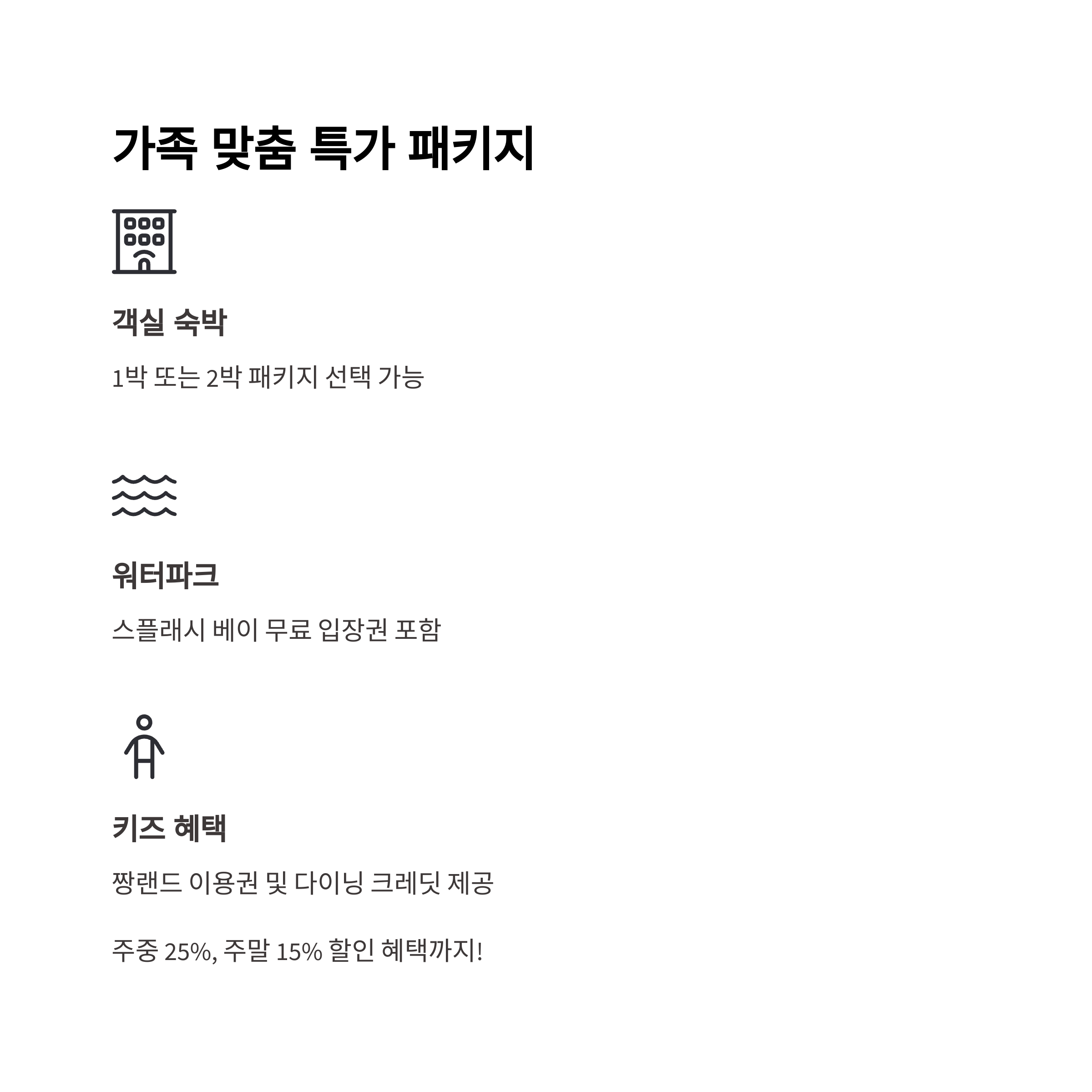 계절별로 다양한 테마 패키지가 출시되며, 가족·커플·웰니스 여행 콘셉트에 맞춘 맞춤형 상품들이 지속적으로 업데이트되고 있습니다. 특히 주중과 주말에 따라 할인율이 다르게 적용되어 더욱 합리적인 가격으로 이용할 수 있습니다.
