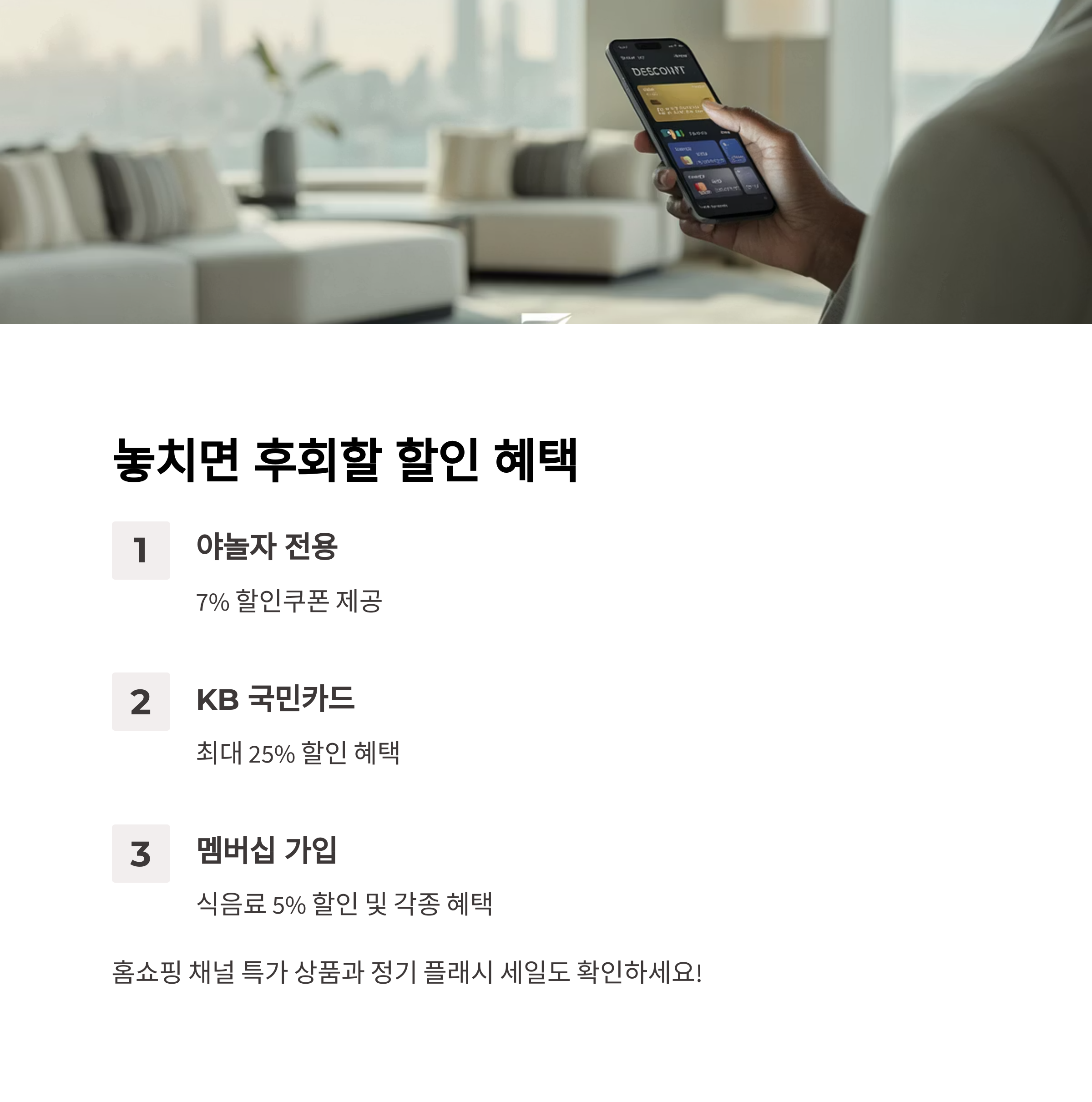 특히 주중(월~목) 투숙 시 25% 할인, 주말 및 공휴일 투숙 시 15% 할인이 적용되는 카드사 혜택을 활용하면 상당한 비용 절약이 가능합니다. 또한 CJ온스타일 등 홈쇼핑 채널에서 진행하는 특가 상품도 놓치지 말아야 할 할인 기회입니다.