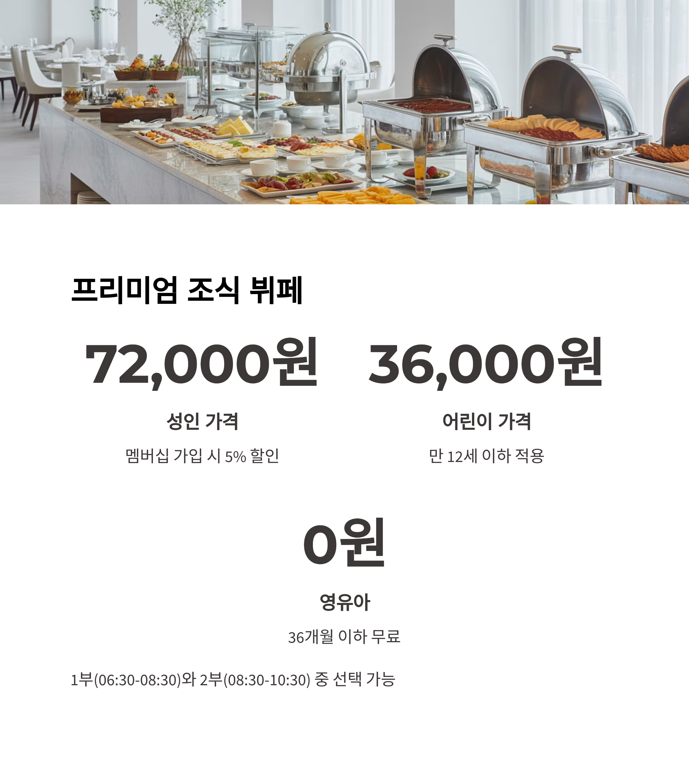 조식 뷔페 가격은 성인 기준 72,000원, 어린이(만 12세 이하) 36,000원이며, 36개월 이하 영유아는 무료로 이용할 수 있습니다. 인스파이어 리조트 멤버십에 가입하면 5% 할인 혜택을 받을 수 있어 더욱 합리적인 가격으로 이용 가능합니다.