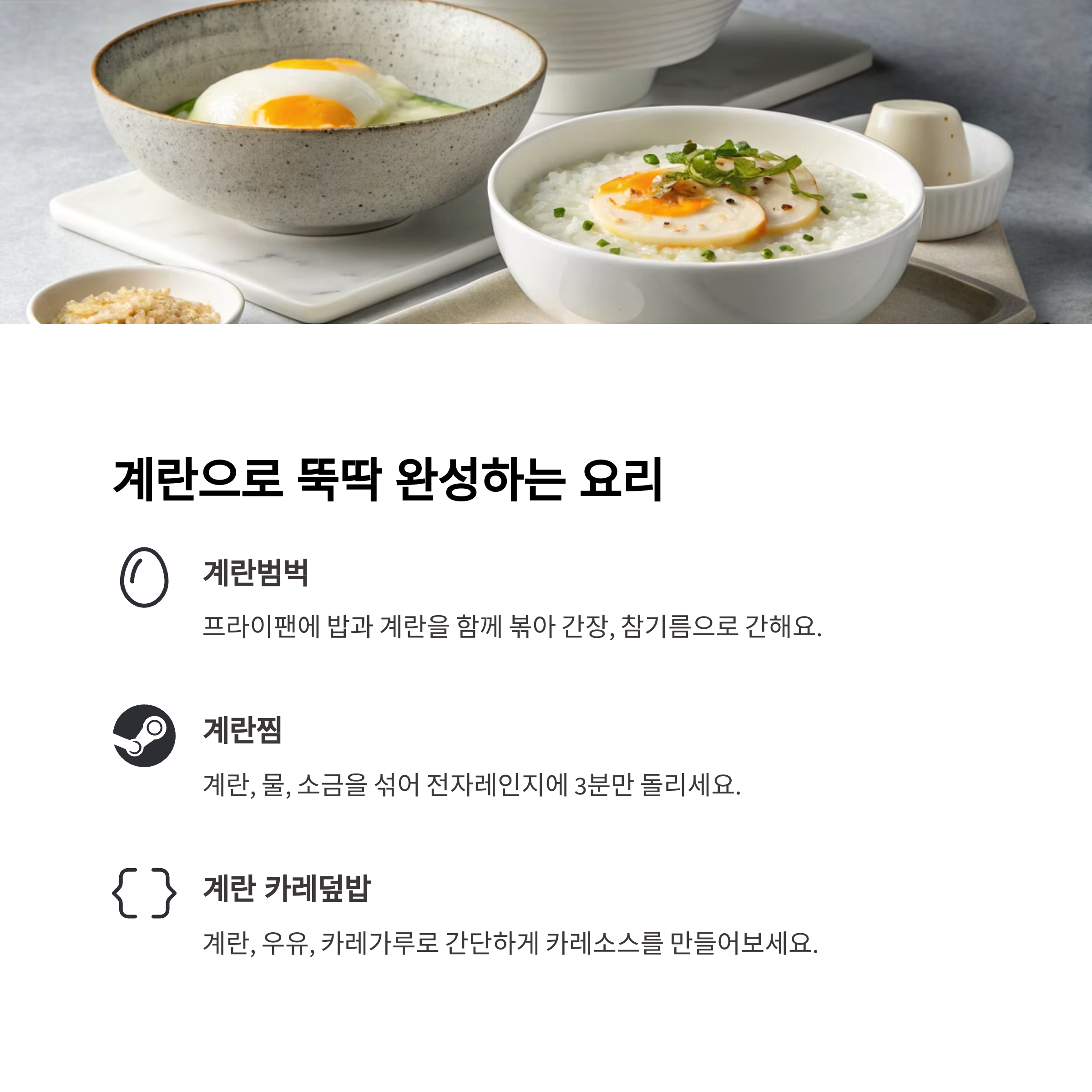계란은 자취생에게 가장 친숙하고 활용도 높은 식재료입니다. 저렴한 가격으로 단백질 섭취가 가능하며, 다양한 요리에 활용할 수 있어 자취생 냉장고에 항상 구비해두면 좋습니다. 계란으로 만드는 간단한 한 그릇 요리를 소개합니다.