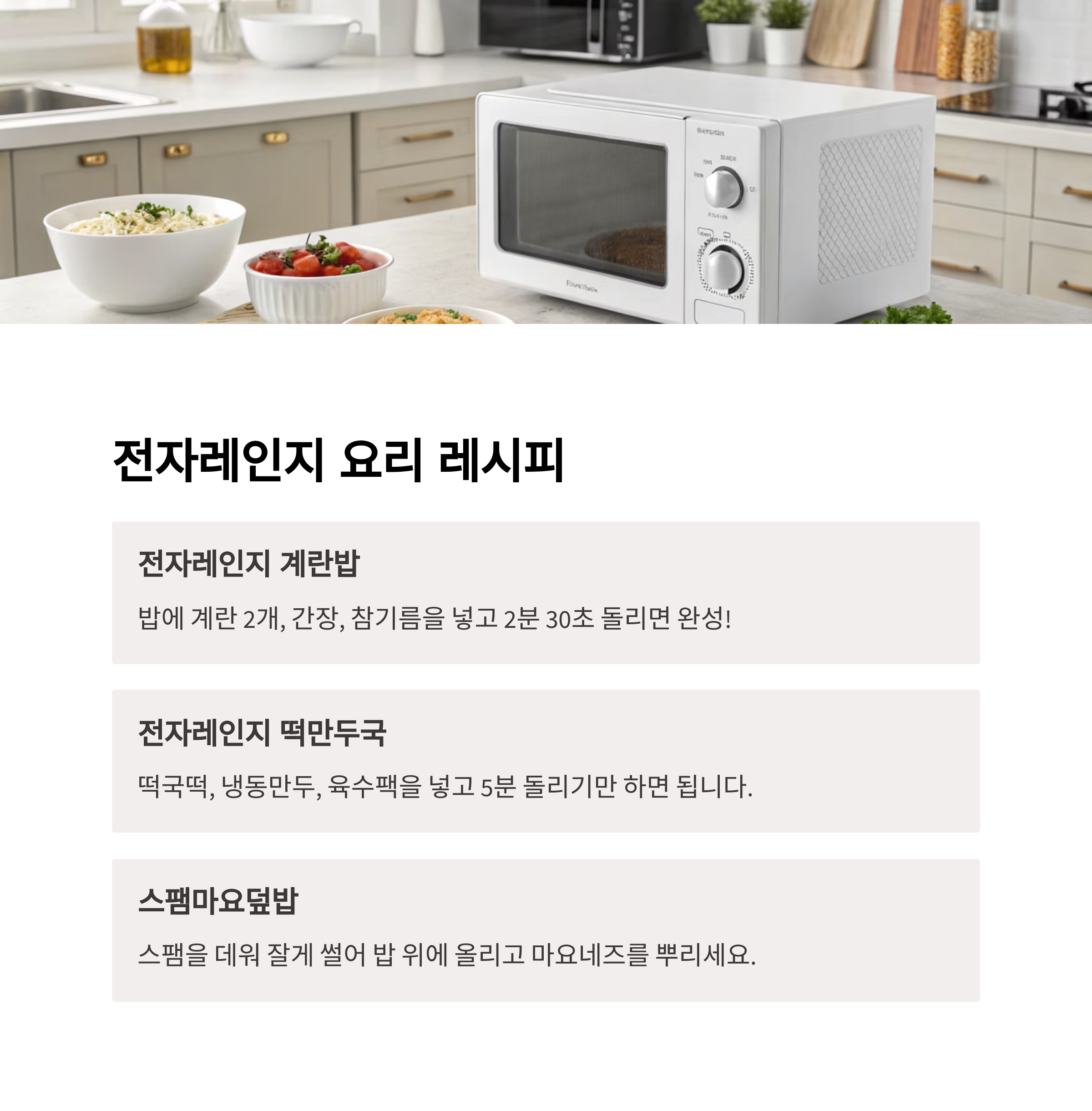 - 전자레인지와 에어프라이어 등 조리 가전을 활용하면 시간을 크게 절약할 수 있습니다.