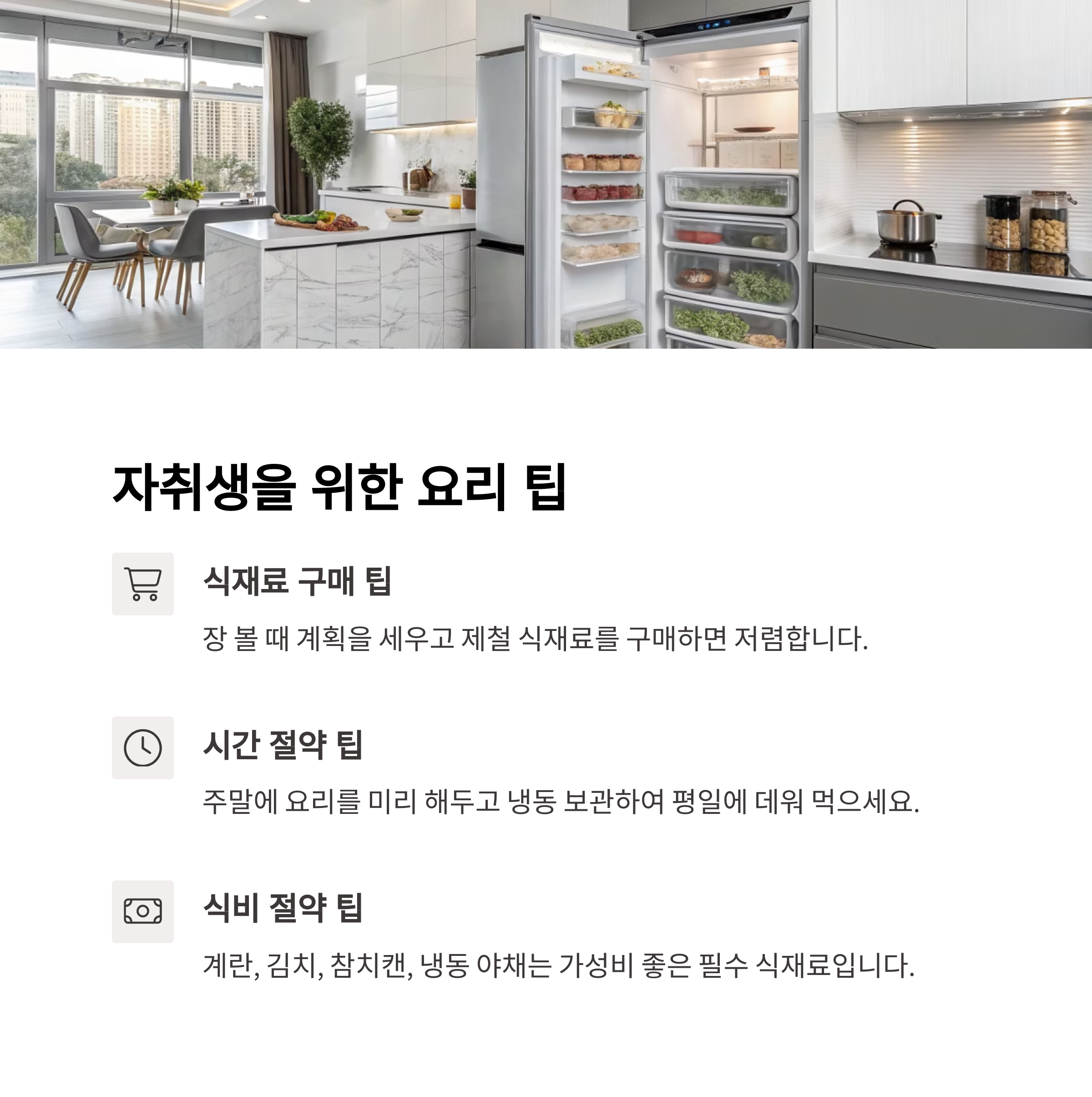 이 글이 바쁜 일상 속에서도 건강하고 맛있는 식사를 챙기려는 자취생들에게 도움이 되길 바랍니다. 자취생활도 맛있게, 건강하게 즐겨보세요!