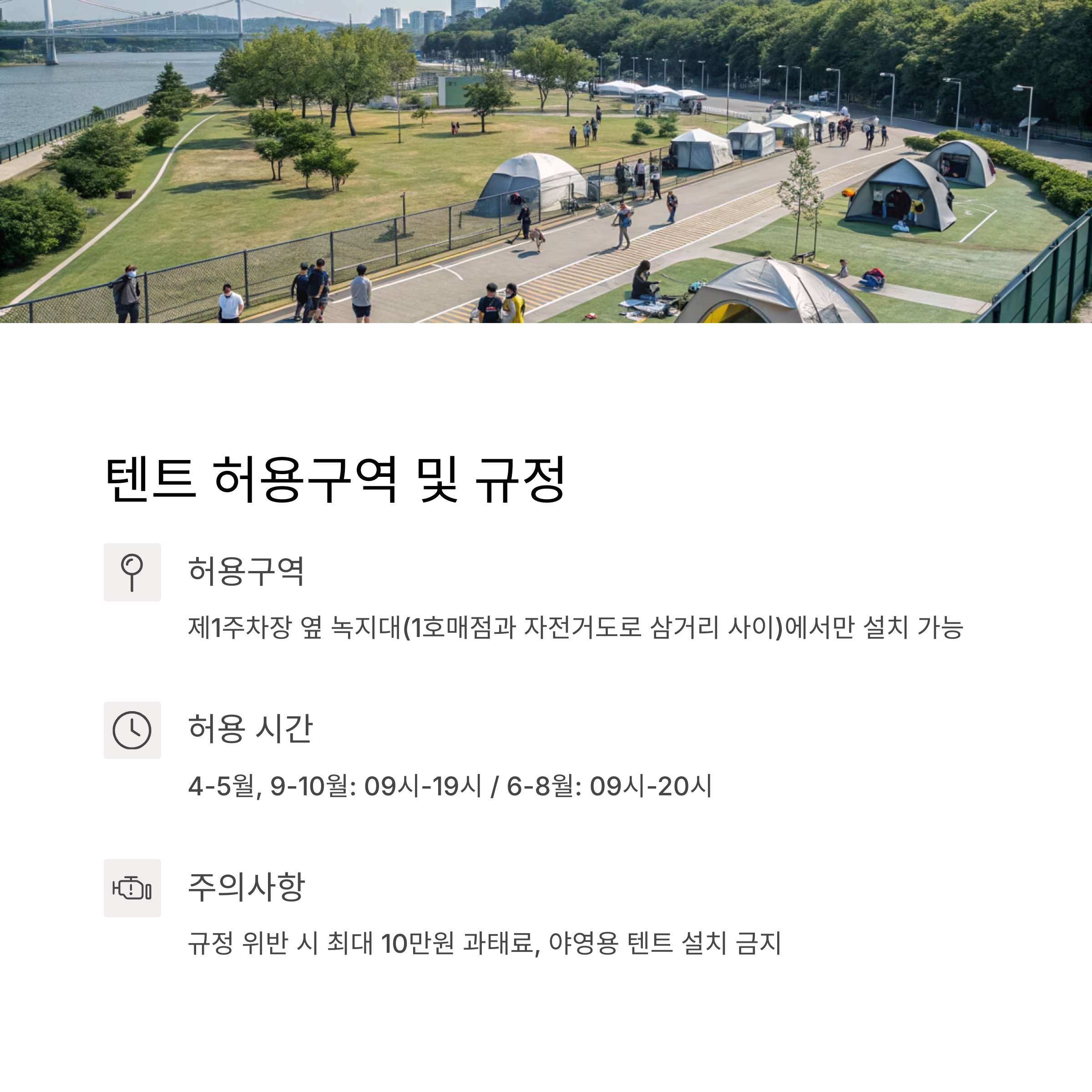 한강공원에서 텐트 설치 시 다음과 같은 규정을 준수해야 합니다.