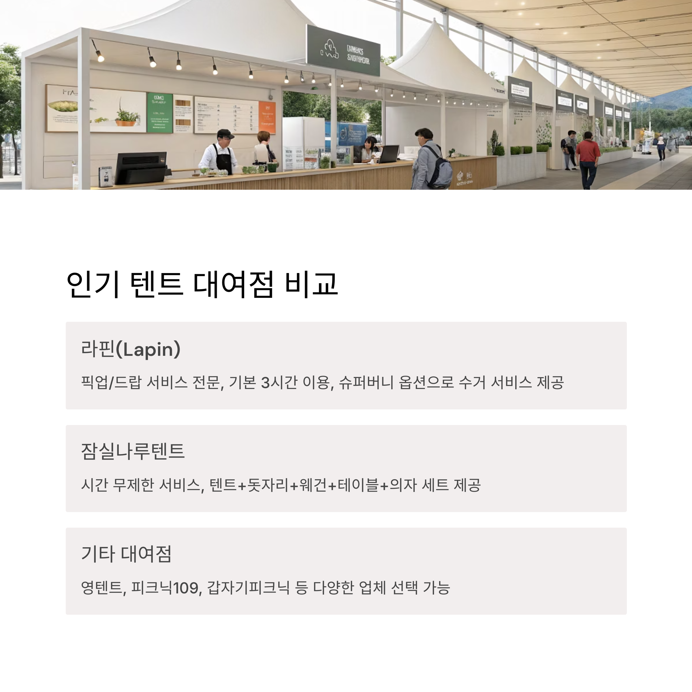 이 외에도 영텐트, 피크닉109, 갑자기피크닉 등 여러 업체들이 잠실 및 인근 한강공원에서 텐트 대여 서비스를 제공하고 있습니다. 각 업체별로 이용 시간, 구성품, 가격 등이 다르므로 본인의 필요에 맞는 업체를 선택하는 것이 좋습니다.