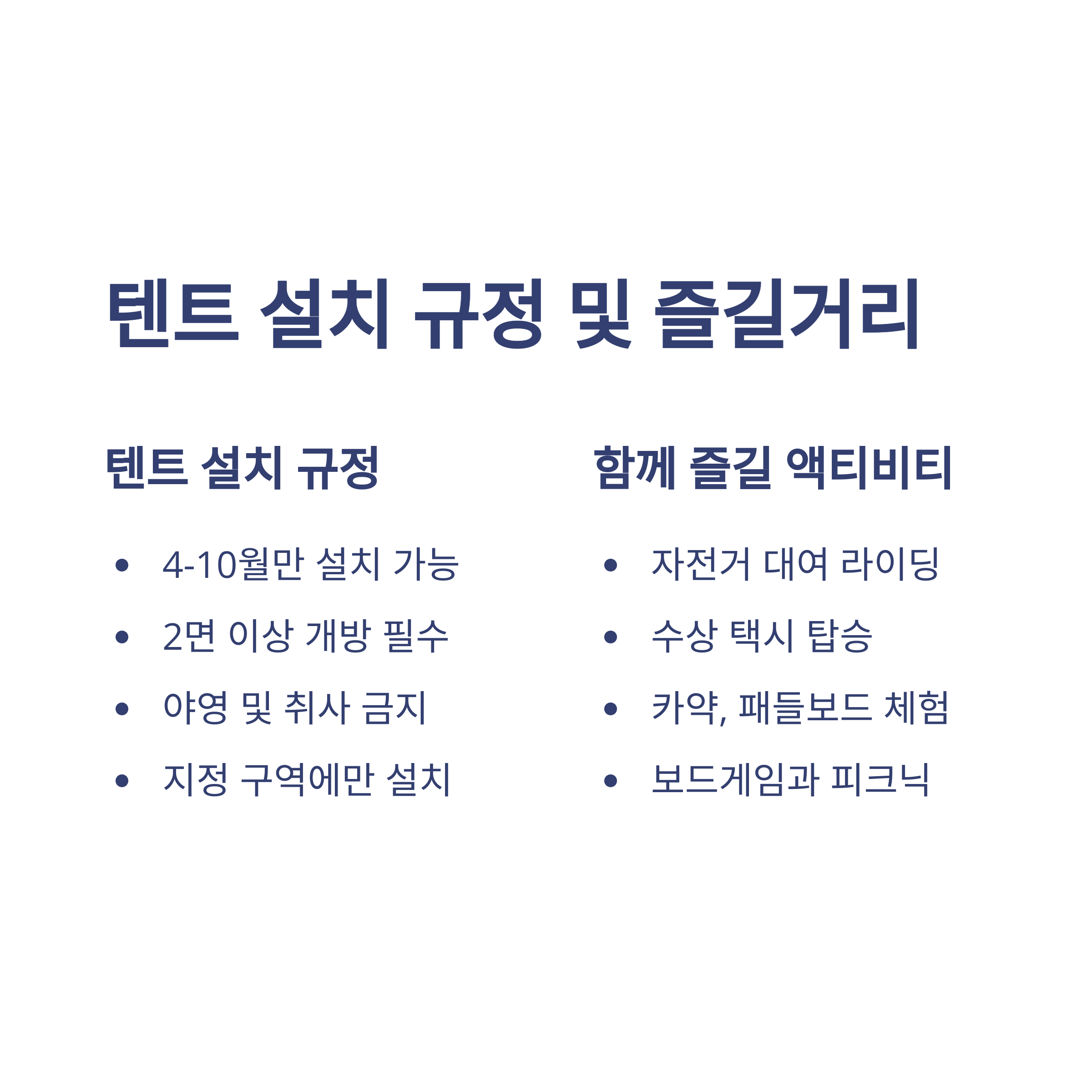 - 저녁 7시부터는 텐트 이용이 제한되며 이후부터는 돗자리만 이용 가능